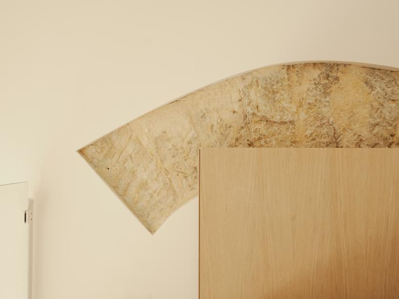 Al piano terra vengono collocati una zona giorno con uno spazio di lavoro su disegno, un piccolo angolo cucina ed il bagno, quest’ultimo rivestito da una boiserie di specchi che ne smaterializza e nasconde il volume.