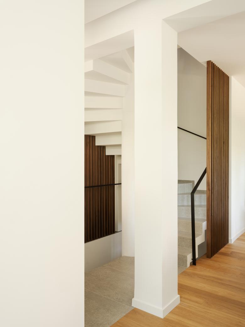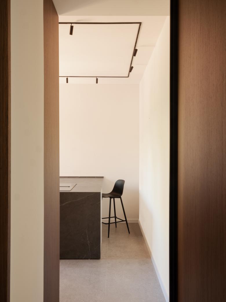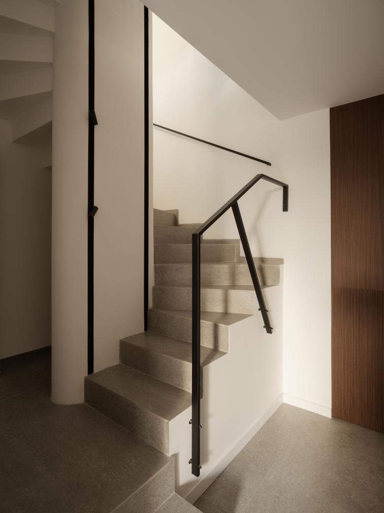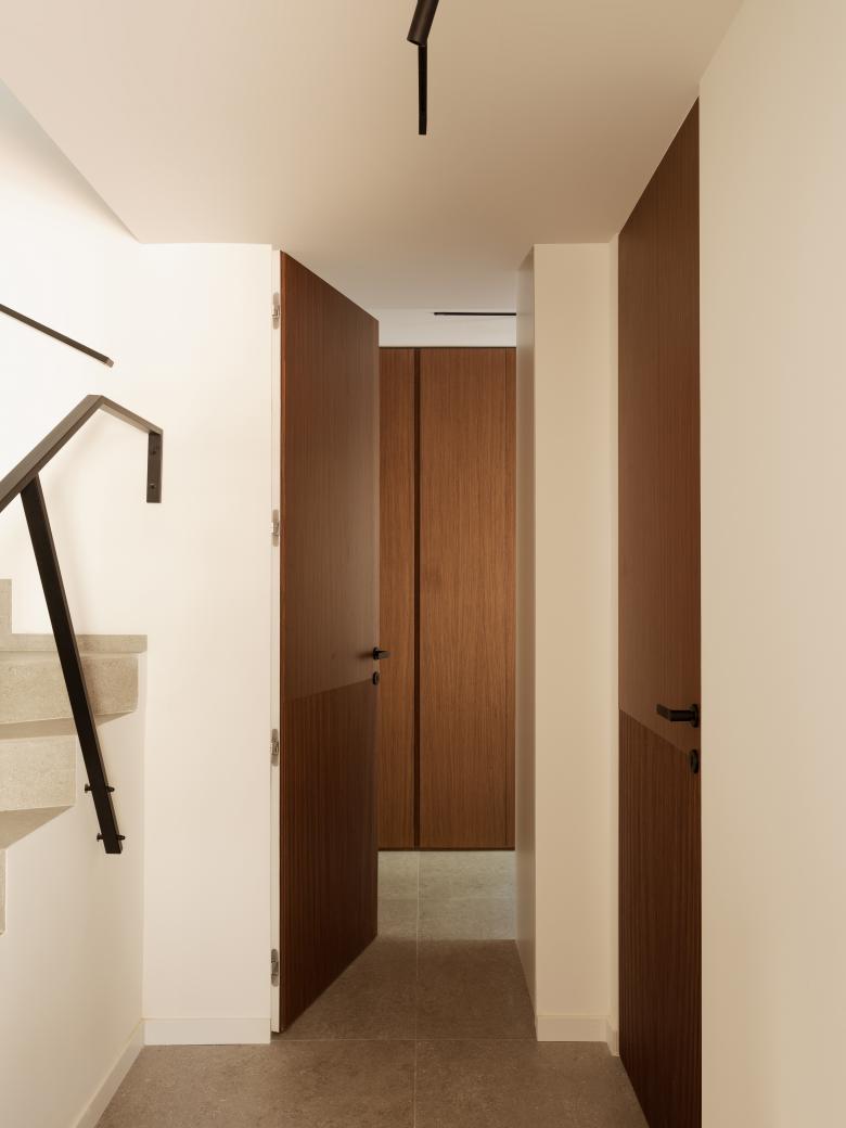 La scala a pianta quadrata, elemento di raccordo con gli altri livelli, è stata completamente ripensata, l’illuminazione viene integrata attraverso un sistema di binari inseriti nel setto centrale e portante, il parapetto viene ridisegnato e vengono aggiunte inoltre, delle pannellature in listelli di legno, che fungono da protezione e filtro visivo. Al piano inferiore, viene alloggiata la zona notte che comprende, la camera padronale con bagno en suite, una seconda camera con cabina armadi e una camera ospiti con bagno. Gli arredi sono tutti principalmente custom, nel corridoio in particolare, vengono disegnate delle porte filo muro alte 2,50 m in noce canaletto e legno listellato.