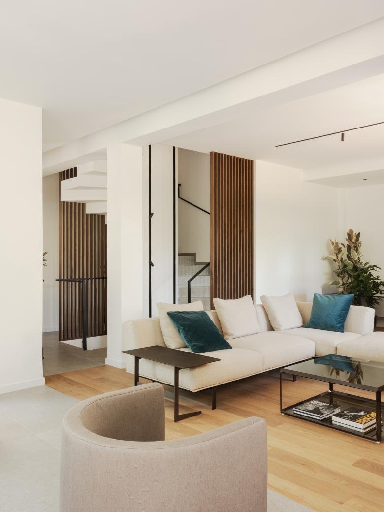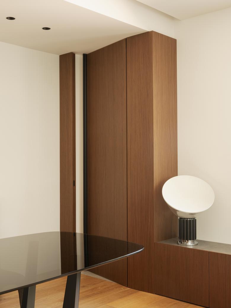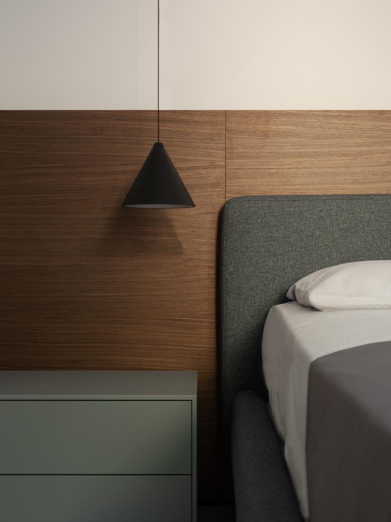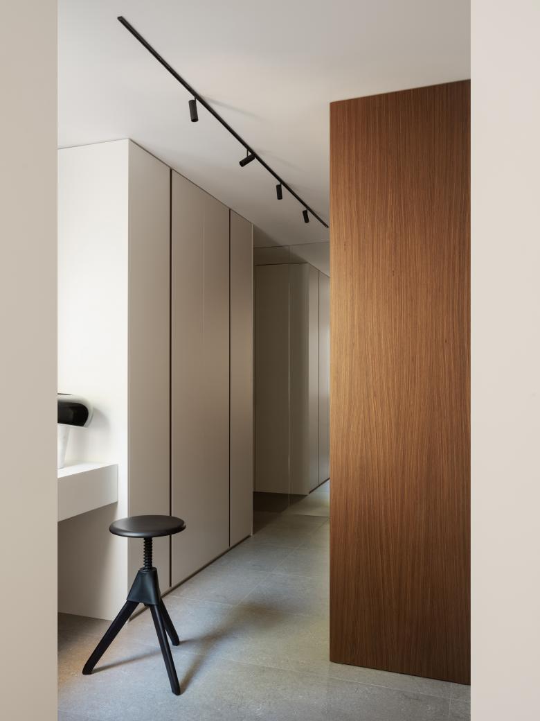 La scala a pianta quadrata, elemento di raccordo con gli altri livelli, è stata completamente ripensata, l’illuminazione viene integrata attraverso un sistema di binari inseriti nel setto centrale e portante, il parapetto viene ridisegnato e vengono aggiunte inoltre, delle pannellature in listelli di legno, che fungono da protezione e filtro visivo. Al piano inferiore, viene alloggiata la zona notte che comprende, la camera padronale con bagno en suite, una seconda camera con cabina armadi e una camera ospiti con bagno. Gli arredi sono tutti principalmente custom, nel corridoio in particolare, vengono disegnate delle porte filo muro alte 2,50 m in noce canaletto e legno listellato.