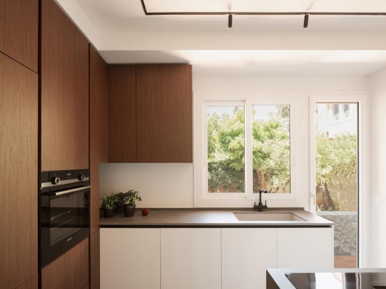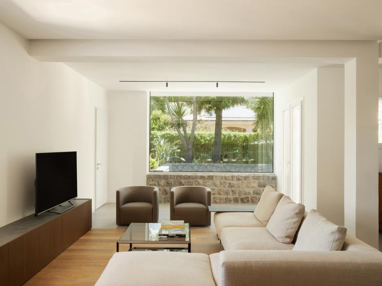 Al piano terra, oltre la cucina, rimane il living che conversa con il giardino attraverso la grande finestra a nastro rettangolare.