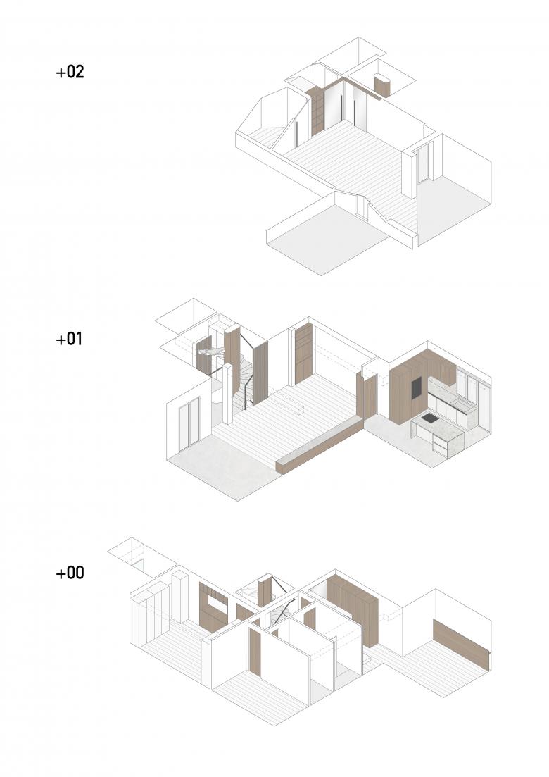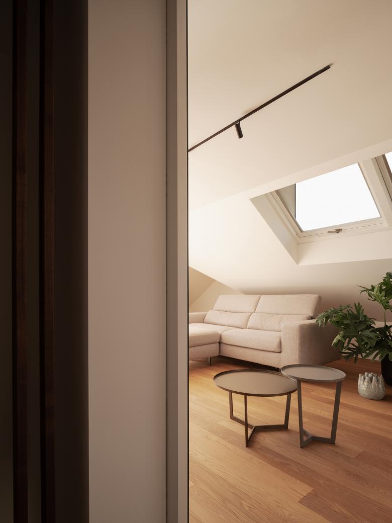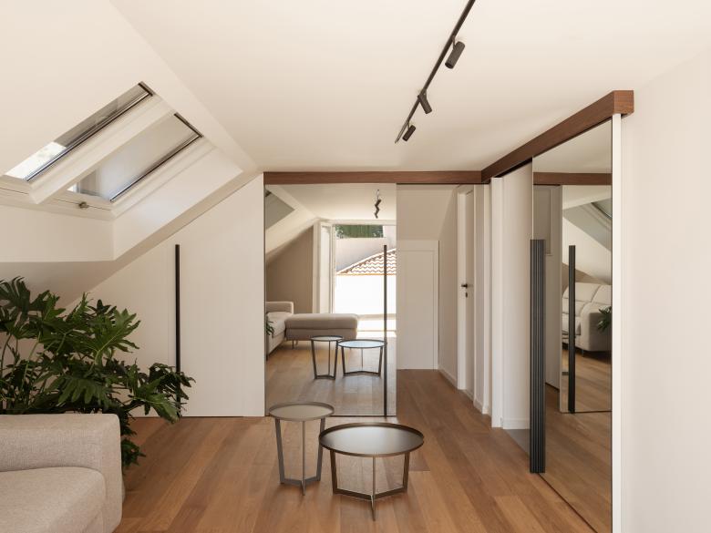 La mansarda al piano superiore, riservata agli ospiti e al relax, gode di un terrazzino e di luce zenitale. Un sistema su disegno con porte scorrevoli, scherma i servizi al piano e funge da libreria-contenitore.