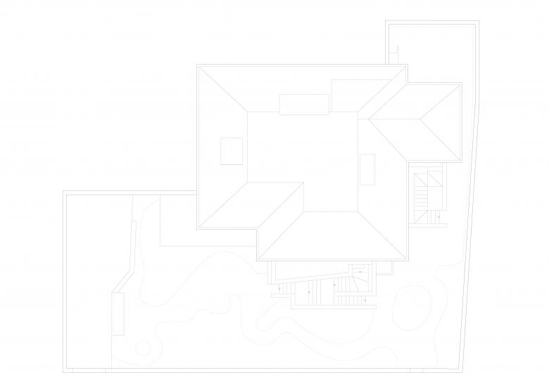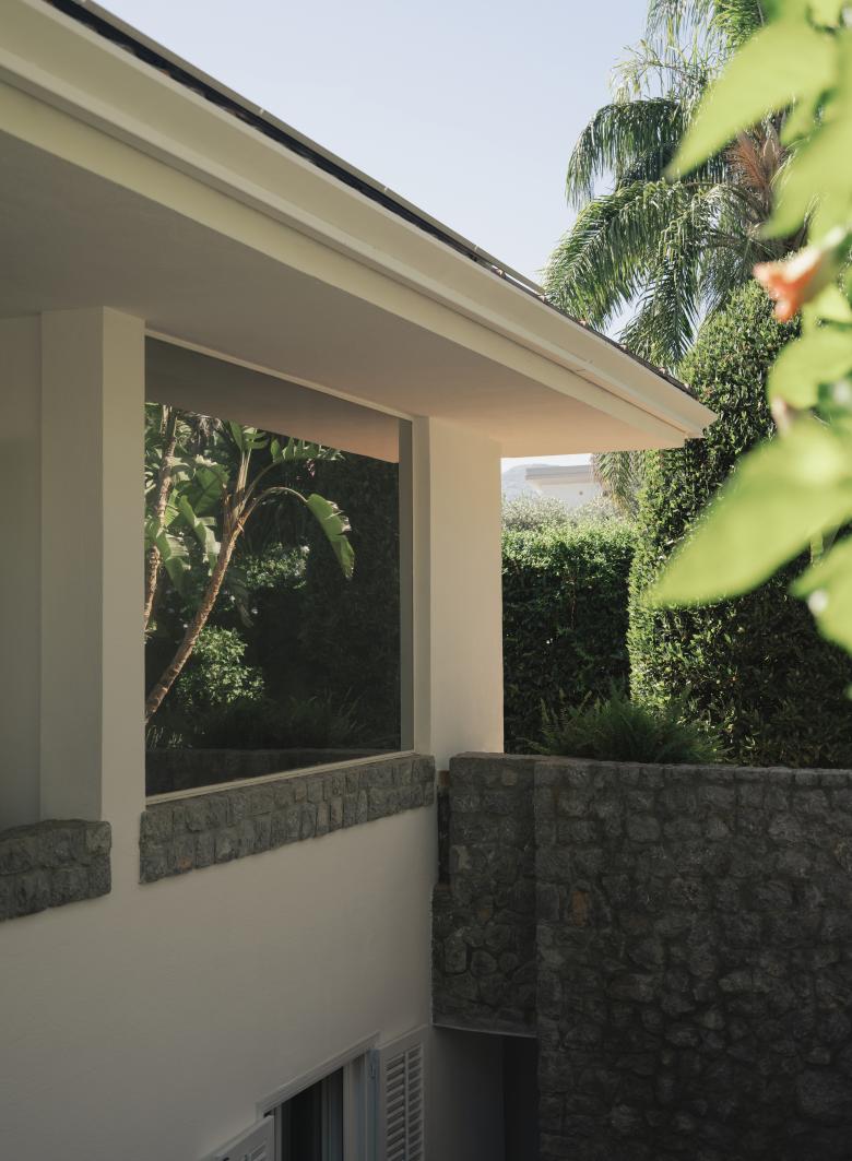 Il volume della casa, è caratterizzato dall’inserimento di due corti semi-ipogee in spessi muri di pietra che collegano il piano inferiore al giardino e infondono luce agli ambienti sottomessi. La facciata con il tetto a falde, i portici ed una marcata orizzontalità integrata nel paesaggio, rimanda ad una architettura di chiara ispirazione Wrightiana.