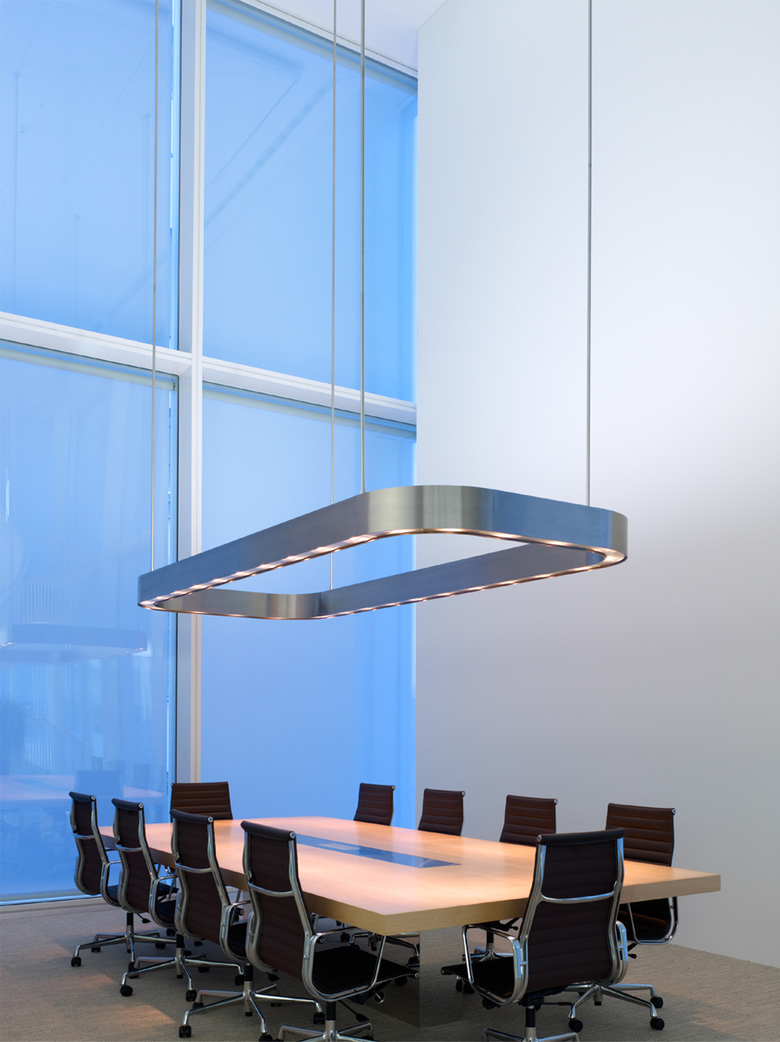Einen ähnlich schwebenden Eindruck provozieren auch die großen Sonderleuchten in den Konferenzbereichen. Wie eine zweite Ebene wurden sie in den zweigeschossigen Räumen abgependelt und geben indirektes als auch druckvolles direktes Licht auf den Tisch ab. Die Pendelleuchte wird zum skulpturalen Element, welches in dem hohen Raum Licht und Lichtstimmung auf Augenhöhe des Nutzers senkt und damit eine angenehme Arbeitsatmosphäre schafft.