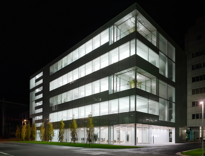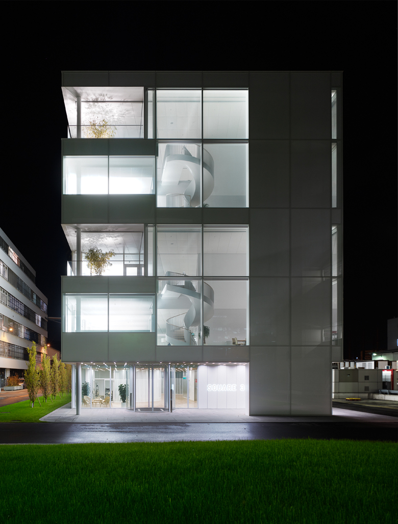 Von Außen betrachtet, ändert sich das Erscheinungsbild der Fassade bei Dunkelheit ins Gegensätzliche. Während das Gebäude untertags wie ein geschlossenes Volumen wirkt, so spielt es nachts mit dem Kunstlicht in seinen Innenräumen. Durch die Transparenz der umlaufenden Fensterbänder scheint das Gebäude wie ein Leuchtkörper von innen heraus zu glühen und gibt dem Betrachter Einblick auf die Unteransicht der indirekt angestrahlten, unberührten Raumdecken.
