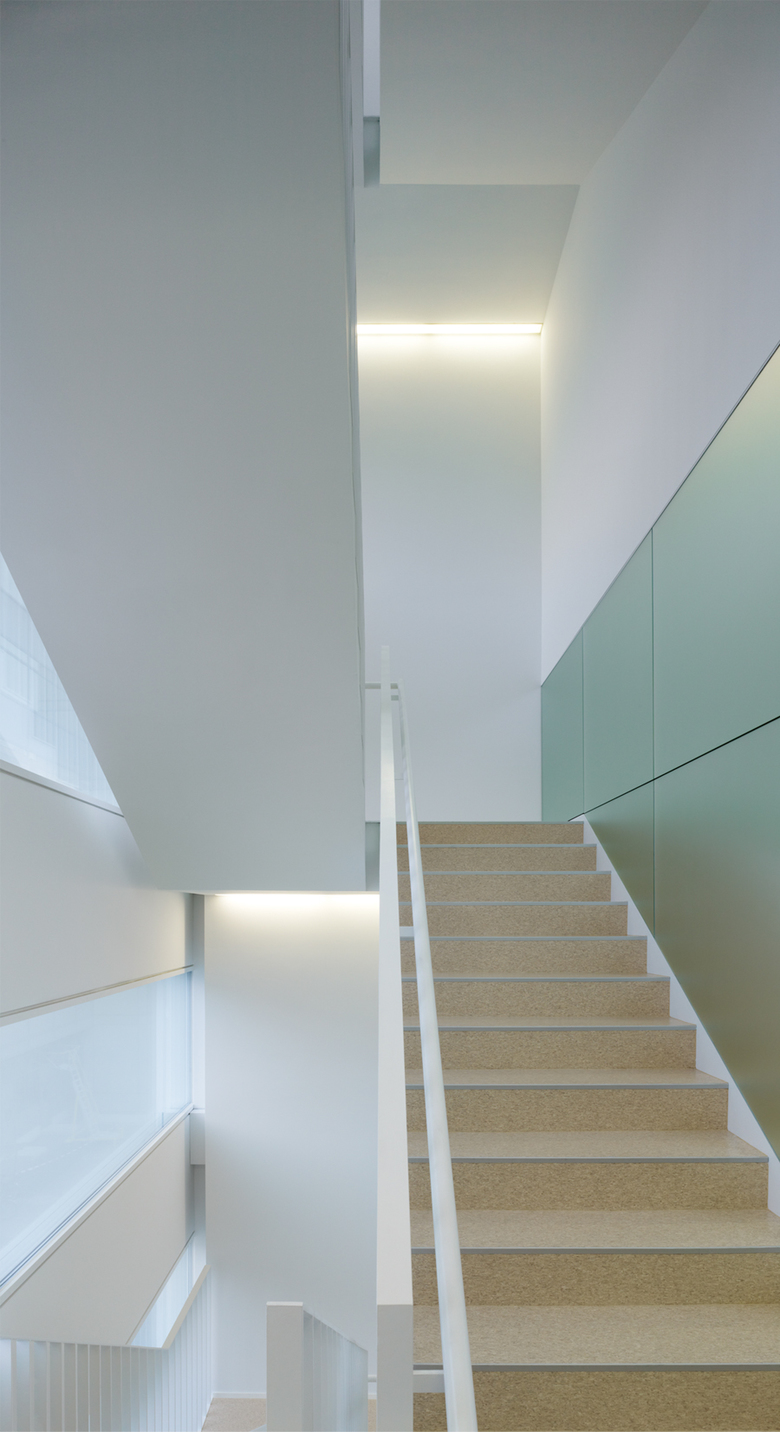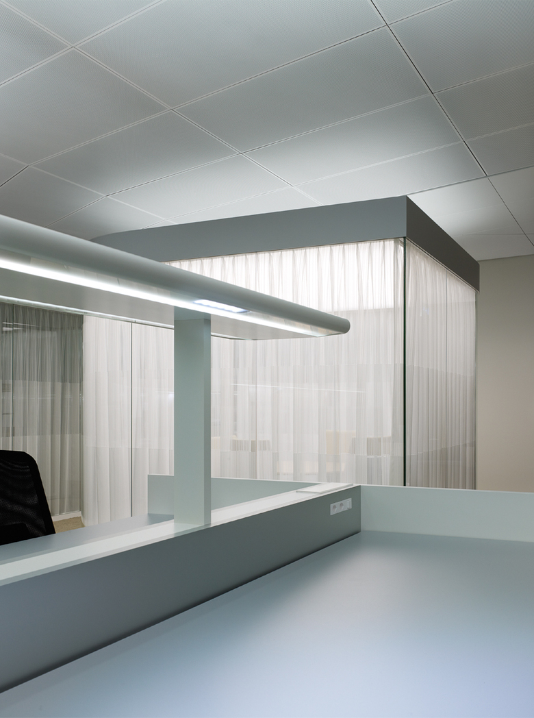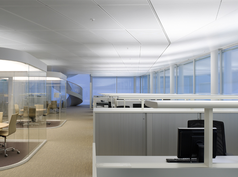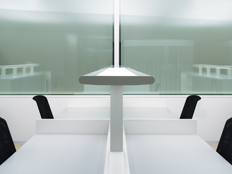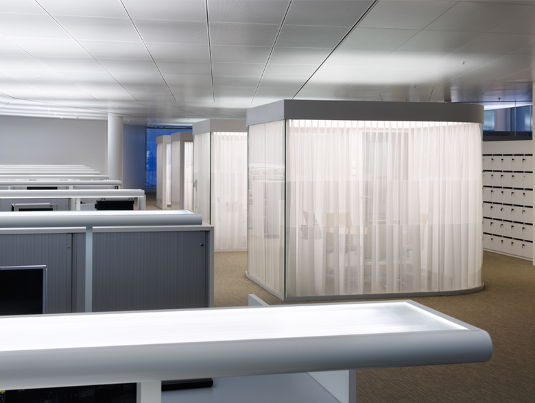 Zusätzlich wurden Besprechungsräume als einzelne, abgeschlossene Inseln inmitten der Großraumbüros ausgebildet. Basierend auf der architektonischen Idee einer „Transparent Glowing Box“ wurden die sogenannten „Private Rooms“ mit raumgroßen Lichtdecken ausgestattet. Diese übernehmen grundsätzlich zwei Lichtfunktionen: Die gleichmäßige Ausleuchtung des Besprechungsortes und die Beleuchtung der umlaufenden Bewegungszone. Dazu wurde die obere Abdeckung der „Private Rooms“ als laminiertes Glas mit transluzenter Zwischenfolie ausgeführt, um die Raumdecke indirekt zu beleuchten und damit auch die benachbarte Flurzone zu erfassen.