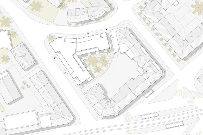 Das Eckgrundstück Goldbrunnen-/Nussbaumstrasse ist in nächster Nähe zum Goldbrunnenplatz. Der winkelförmige Neubau, bestehend aus zwei Schenkeln, korrigiert die städtebaulich unklare Situation an der Nussbaumstrasse mit der Setzung eines strassenbegleitenden Gebäudes auf der Baulinie.