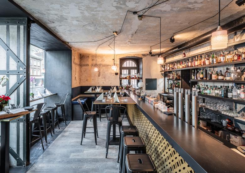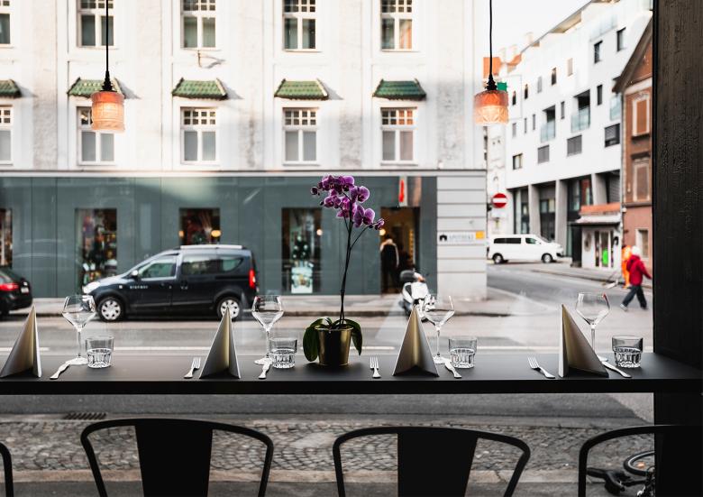 Die räumliche Aufteilung des Lokals unterstützt diesen Ansatz hervorragend: im hinteren Bereich sitzt man auf der langen Bank oder bequemen Stühlen in privater und ruhiger Atmosphäre, perfekt für ein geschäftliches Meeting oder den Plausch mit der besten Freundin. Die große Fensterfront kann im Sommer geöffnet werden und bietet dann Zugang zu einem lauschigen Gastgarten. Im Winter schafft das Panoramafenster trotz der Zurückgezogenheit einen Bezugspunkt zur Außenwelt.