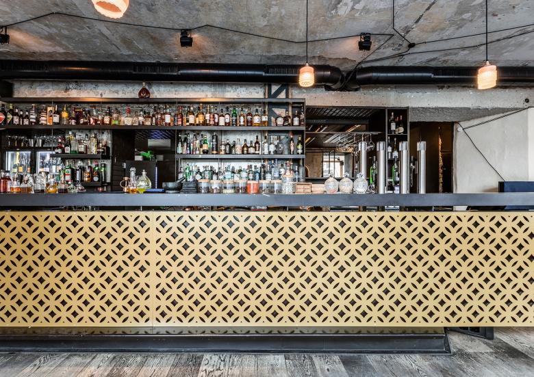 Der vordere Bereich bietet das absolute Kontrastprogramm. Hier trifft man sich an Stehtischen zum schnellen Kaffee, lockeren Small Talk oder unverhofften Feierabend-Drink mit Freunden. Dabei darf es ruhig etwas lauter und lustiger werden. Herzstück ist eindeutig die lange Bar, in Gold getaucht gezielt in Szene gesetzt. Die Goldtöne lassen sich als Akzente auch bei Leuchten oder Accessoires wiederfinden. Ein besonderes Element sind die eigens für das L‘ARC angefertigten goldenen Raumtrennelemente aus Metall, die mit ihrer ornamentalen lasergefertigten Optik einen echten mediterranen Hingucker bieten.
