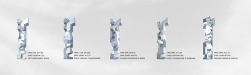 Dispersed, fragmented and instantly repeated. In this new urban experience fashion is not only drove by economic prosperity, but also fueled with the tension of city living: it’s hiding here and showing somewhere else…The Tokyo fashion museum will integrate fashion with the entire city, or, engage the whole city with fashion. It reflects the urban mirage that dispersed into events happening on the streets, in the stations, on top of the buildings; spaces that can observe, move, perform and transform.