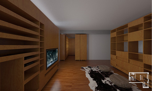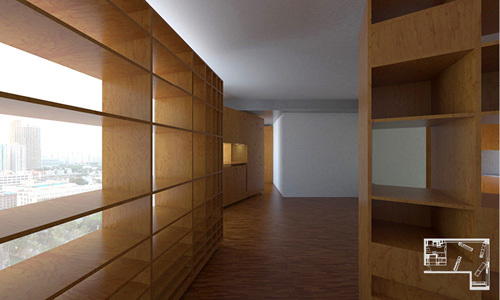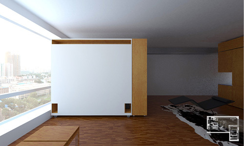 We have condensed all functions into two groups: the “living” and the “extra-living”, each group is built into one corner of the room as multiple movable wall-shelf units, like the library shelves. By using a simple mechanism, the group-form arrangement has effectively answered the inhabitant’s multiple needs to a single space.