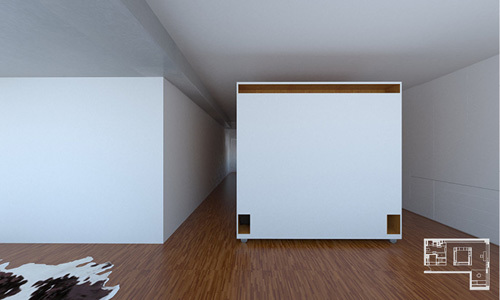 This mechanism is like a three-dimensional everyday version of “klotski”, its movement reveals a stunning spatial variations. In particular, due to the different permeability of wall cabinet units, the scenarios present unexpected changes in light, which could never be achieved by any fixed design.