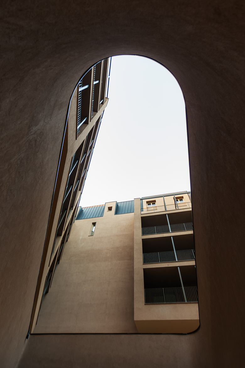 I prospetti interni sono caratterizzati da ampie terrazze lungo lo sviluppo dell’intero edificio, un’immagine che richiama la tipica corte milanese, noto come “Ringhiera”. Questa tipologia è caratterizzata da balconi lungo terrazze che si affacciano lo spazio aperto all’interno. Per quanto riguarda la scelta dei materiali cortile, le murature sono trattate ad colore intonaco tinteggiato sui colori ocra, mentre la copertura dell’ultimo livello è rivestito da pannelli in zinco-titanio ad alta performance.