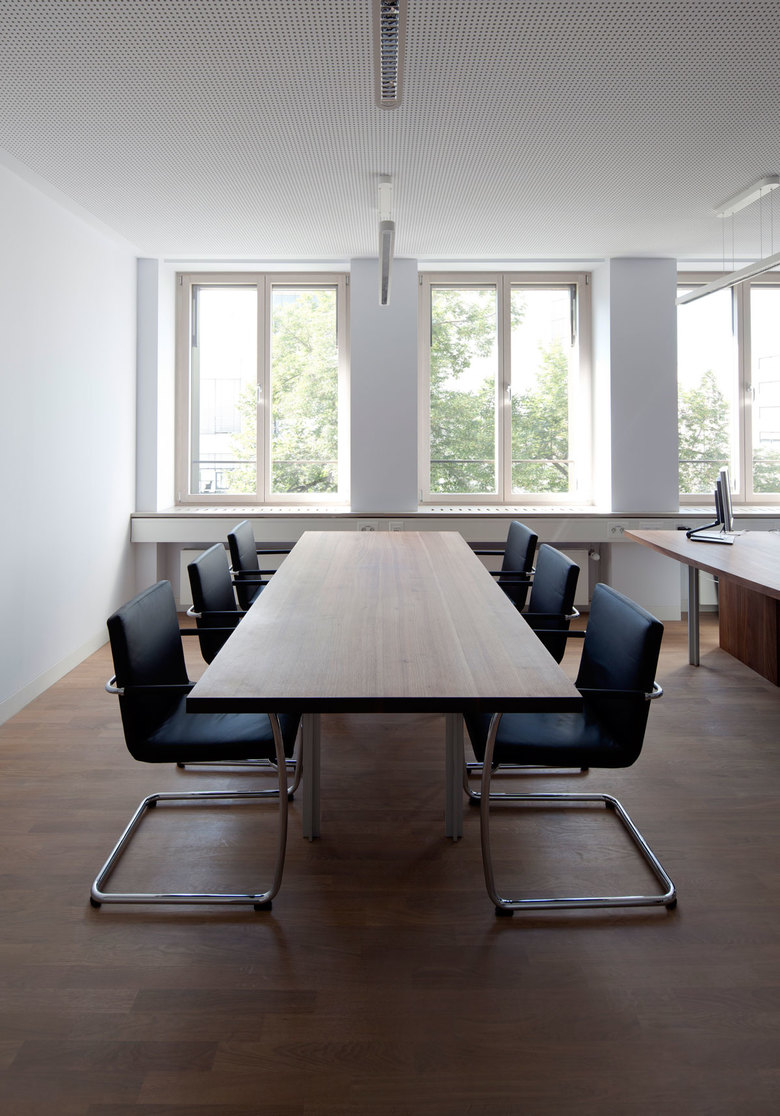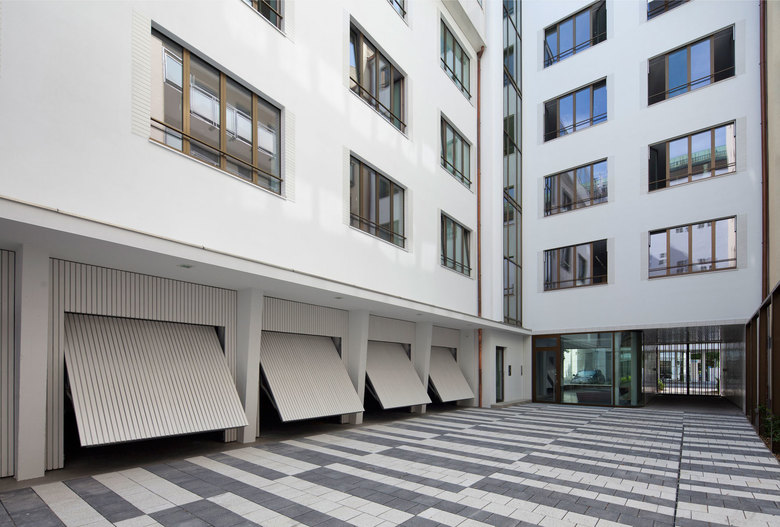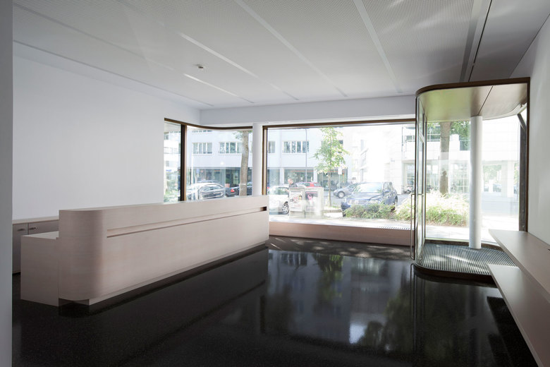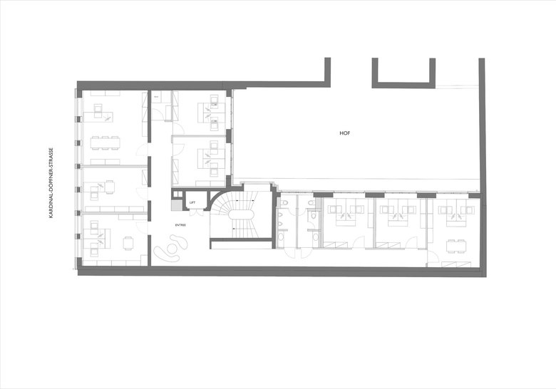 Der Friseurladen im Erdgeschoss wich einem repräsentativen Foyer- und Ausstellungsraum, der sich zum Hof hin öffnet und nun Ein- und Durchblicke erlaubt. Die restlichen Geschosse wurden in Büroflächen umgewandelt. In den Geschossebenen wurden die Liftvorzonen in die Büroeinheiten integriert. So entstand ein großzügiger Entree- und Wartebereich an der Nahtstelle vom Hauptgebäude zum Hofflügel.