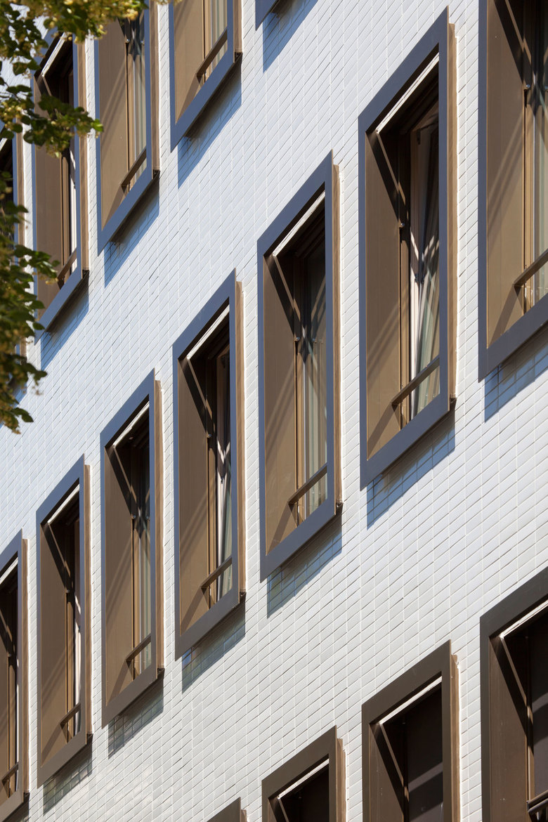 Glänzend weiss glasierte Fliesen lassen durch ihre Handhandwerkliche Verlegung mit den daraus resultierenden feinen Unregelmäßigkeiten die Fassade in den Spiegelungen der Umgebung changieren.
