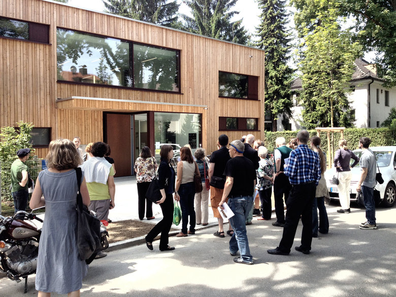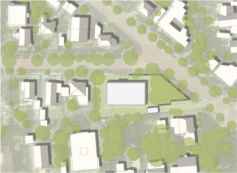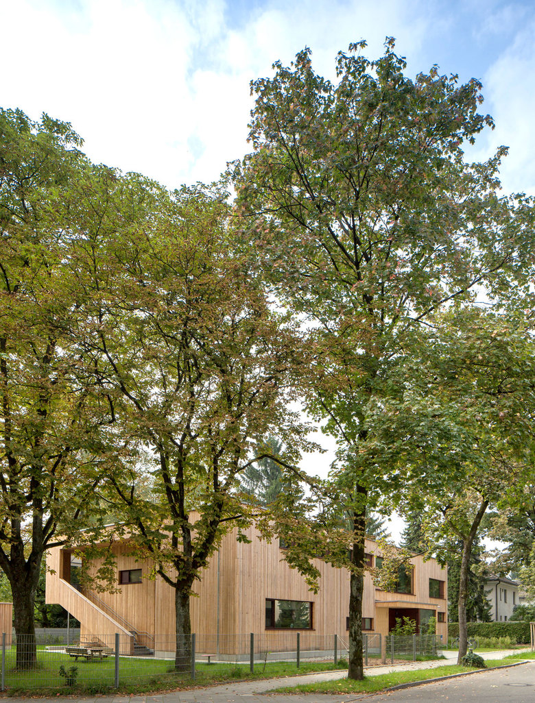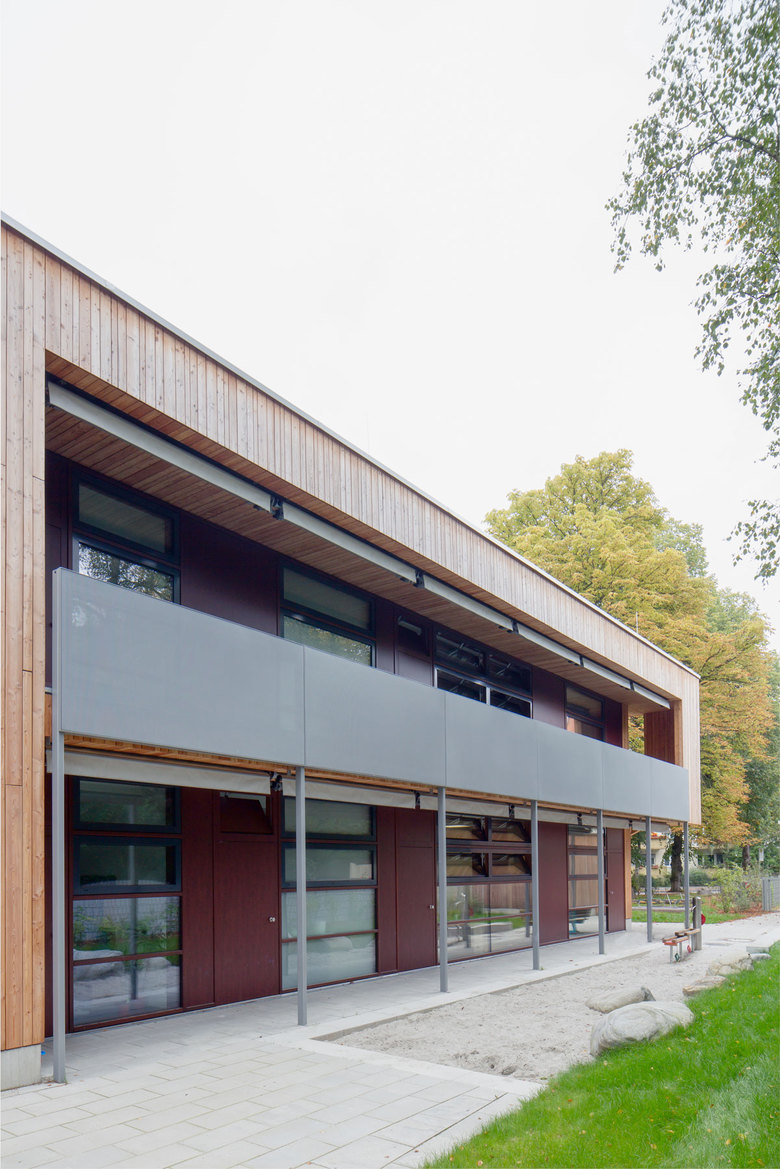 Ein zweigeschossiges, lärchenholzverkleidetes Gebäude mit flachem Dach wird am nordwestlichen Rand des Grundstückes platziert. Westlich vorgelagert zur Alten Allee bleiben die alten Laubbäume erhalten und bilden eine baumüberstandene, sonnengeschützte Spielfläche. Durch das Gewirr der Stämme und Äste hindurch fällt der Blick des Passanten auf das hölzerne, rötlichbraune Gebäude mit seiner markanten Aussentreppe.