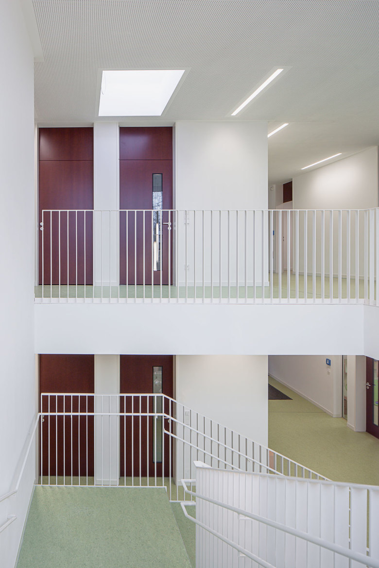 Die Grundrissorganisation mit Gruppenräumen im Süden und Nebenräumen im Norden folgt den funktionalen Erfordernissen. Die als Spielflure ausgelegten Erschließungswege im Gebäude erlauben Ein- und Durchblicke und tragen maßgeblich zur Atmosphäre des Gebäudes bei. Eine kleine zweigeschossige Treppenhalle im Eingangsbereich öffnet durch das von oben über ein großes Panoramafenster einfallende Licht den Blick ins Obergeschoss. Attraktion ist hier die ornamentale Spiegelwandinstallation der Künstlerin Gesine Braun, die mit ihren vielfachen Windungen, Kurven und Spiegelungen Kinder und Erwachsene gleichermaßen fasziniert.
