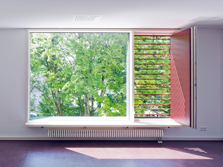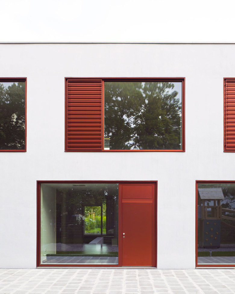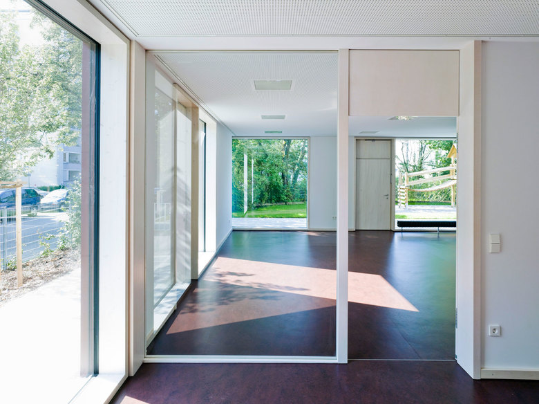 Besondere Gestaltungselemente der Kita sind u.a. die Fenster, die in ihrer Anordnung die Fassade beleben gegenüber der sonst rationalen Fassadengestaltung der umgebenden Gebäude. Die großen Öffnungen ermöglichen einen intensiven Innen-Außenbezug, sind gestaltprägend für die Fassade durch ihre Farbigkeit und gleichzeitig Sitzmöglichkeit im Inneren. Der sowohl aussen wie auch innen zurückhaltende Materialkanon bildet eine ruhige Atmosphäre für die vielfältigen Aktivitäten der Kinder.