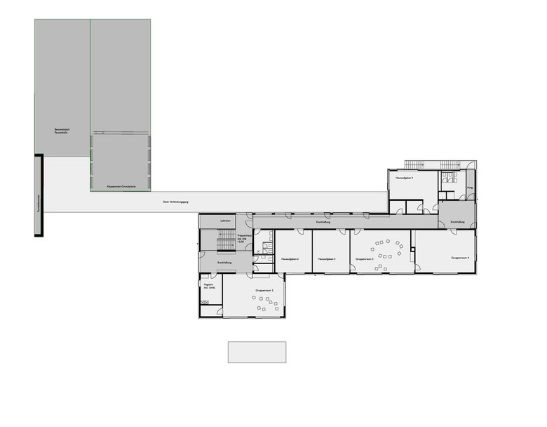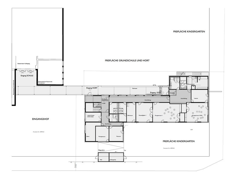 Ein zweigeschossiger, im Grundriss s-förmiger Neubau ordnet die gegenüber den alten Pavillonbauten deutlich größere Baumasse wie selbstverständlich in das Schulensemble der 60er Jahre ein. Eingangshof, Schulhof und neue Freifläche für die Kindergartengruppe werden deutlich gegliedert, ohne deren Zusammenhang zu zerstören. Der Verbindungsgang zwischen Hort und Schule, trennt den Eingangshof vom Schulhof und mündet in den geschützten Eingangsbereich der Kita.
