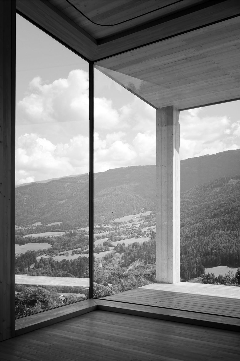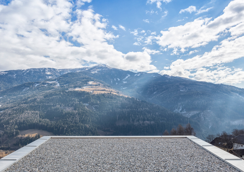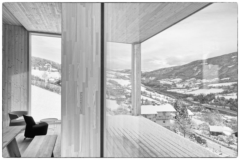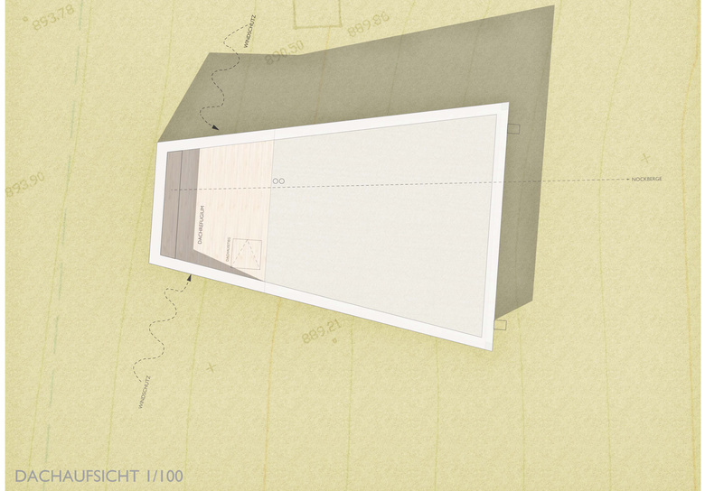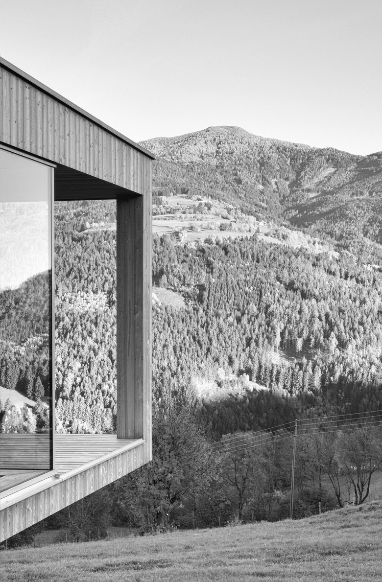 Von Aussen zeigt das Gebäude auf den Längsseiten charakteristische, der Hangneigung folgende Aussenkanten. Dort, wo der Hang am steilsten ist, folgt nicht nur die Unterkante der Fassade sondern auch die Linie der Attika seinem Verlauf. Da das Dach selbst mit einer Neigung von 3% verläuft, entsteht, von der Attika umfasst, ein geschützter, uneinsehbarer Bereich, der auf den beeindruckenden, gegenüberliegenden Zweitausendergipfel des Tschiernock ausgerichtet ist. Wind- und blickgeschützt, sonnen- und sternenexponiert meint man hier den Hauch der Kärntner Bergwelt unmittelbar zu spüren. Weit weg scheint das Dorf und der Rest der Welt. Sonne, Wind, Wolken und Bergblick erzeugen Gefühle des Alleinseins mit sich und der Natur.