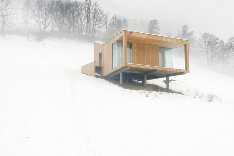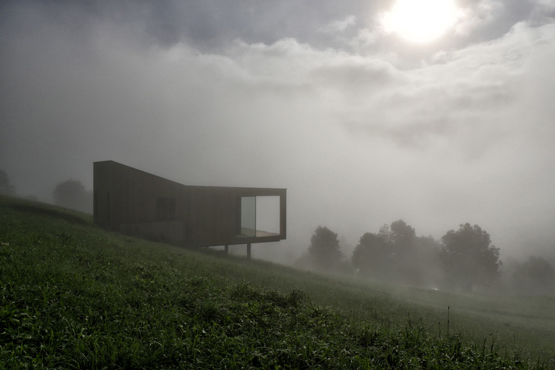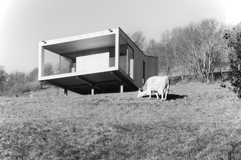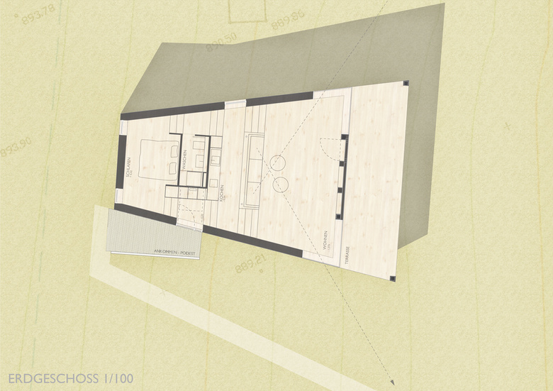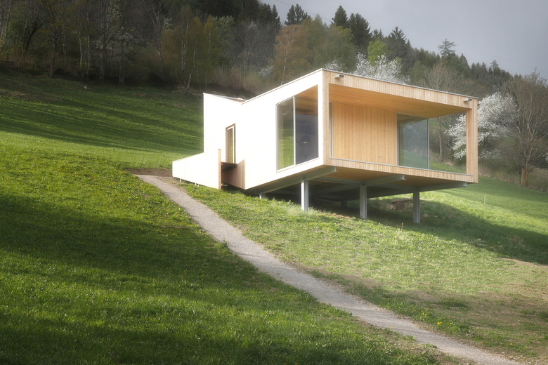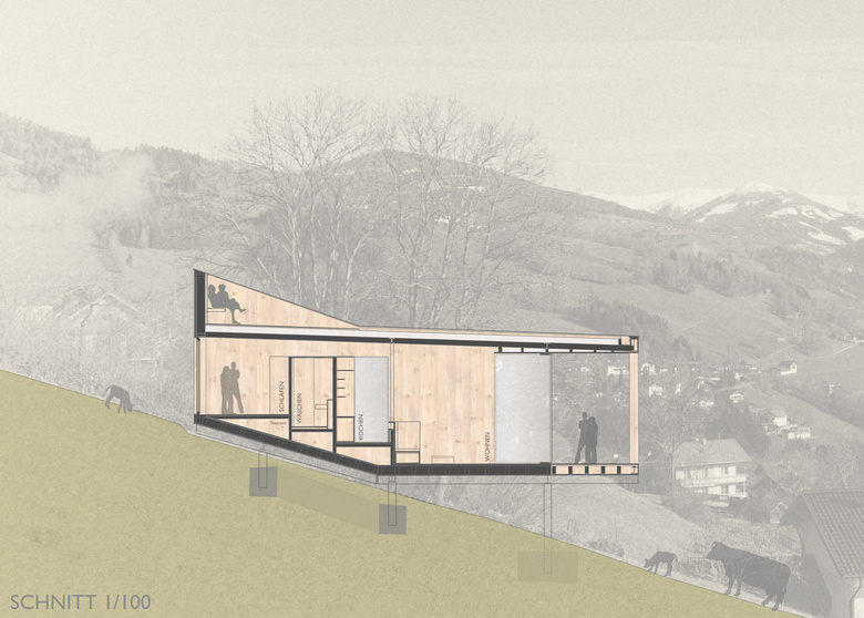 Auf einem Stahlgerüst ruhend folgt der Boden des vorgefertigten Holzbaus dem Hangverlauf um sich im talseitgen Abschnitt davon zu lösen und sich dem Tal entgegenzustrecken. Unter dem Haus bleibt durch die bodenschonende Bauweise ein Lebensraum für Flora und Fauna. Die vor allem für einen Holzbau kritische Zeit der Herstellung der Gebäudehülle bis zu dessen Dichtheit konnte so wesentlich verkürzt werden.