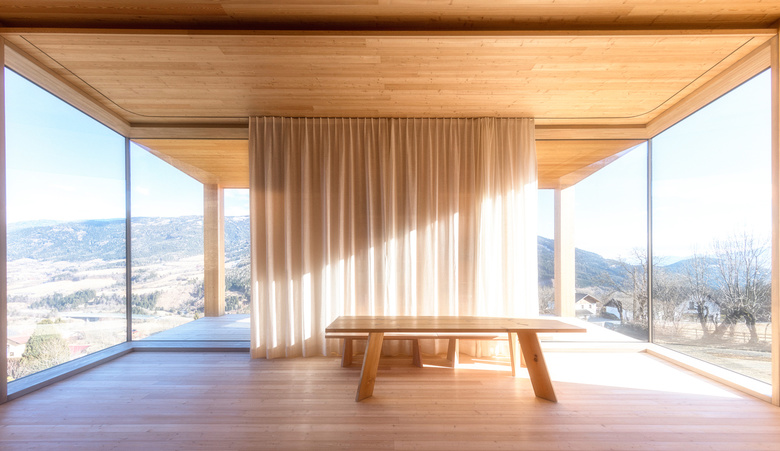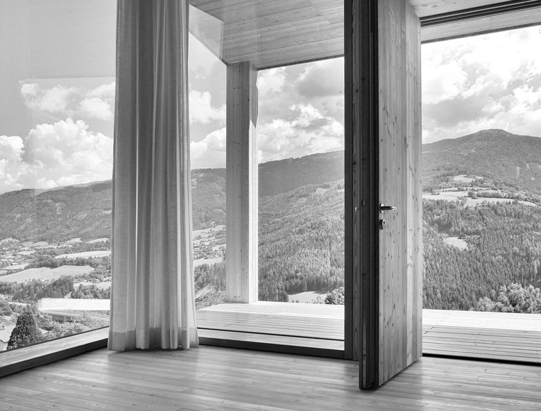 Der konisch, sich talseitig öffnende Grundriss, verstärkt die Hinwendung zum Talraum. Die beiden großen, symetrisch angeordneten Eckverglasungen lenken den Blick in Richtung der beiden Talseiten. Hier sitzt man gerne zum Frühstück, genießt die über den Berg kommende Morgensonne und den weiten Blick.