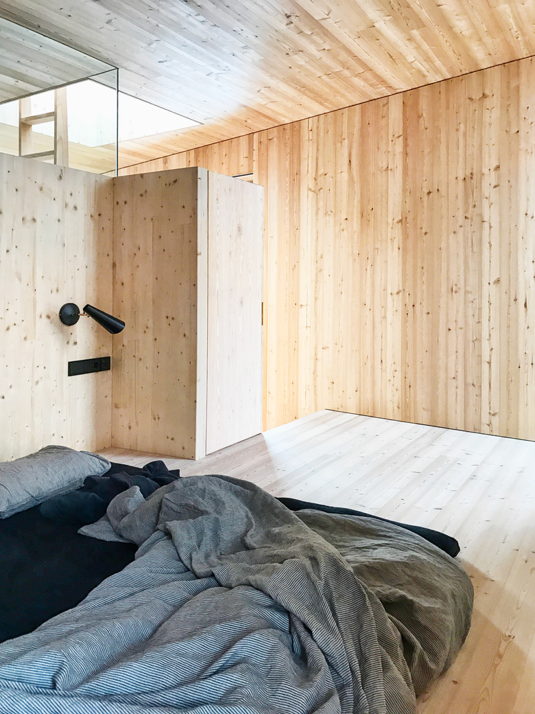 Wie Aussen, so sind auch im Inneren alle Oberflächen in Lärche, teils als Massivholz, teils als Lärchendreischichtplatten ausgeführt. Dabei sind die Oberflächen, die einer höheren Beanspruchung ausgesetzt sind, wie Böden und Einbaumöbel, mit weißpigmentiertem Holzöl eingelassen, was an frischgescheuerte Holzoberlächen in traditionellen Bauernhäusern erinnert. Die übrigen Flächen, wie Wände und Decken, sind unbehandelt. Ausnahme ist das Bad, das aufgrund der Feuchtebeanspruchung komplett mit Linoleum verkleidet ist.
