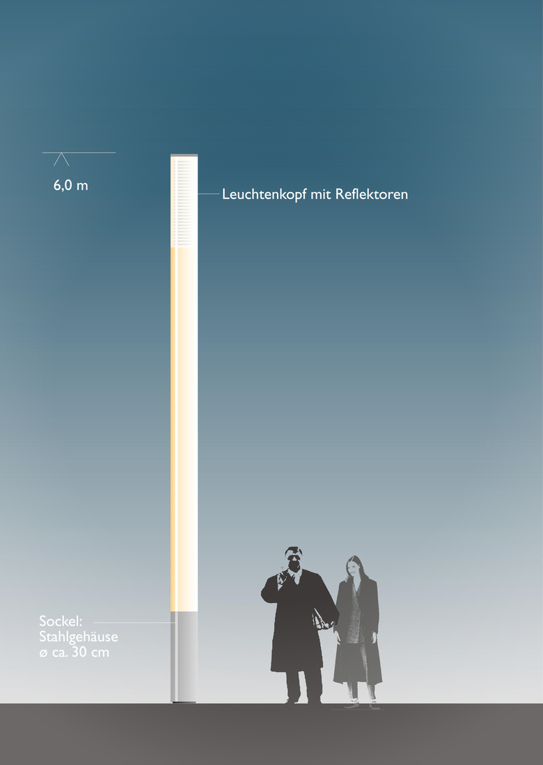 Die Stele selbst ist eine Neuentwicklung und sowohl Straßenleuchte als auch Licht-Kunst-Objekt. Sie weist eine dreiteilige Gliederung auf, bestehend aus einem Sockel für die Elektrotechnik, einem hinterleuchteten, mattierten Glaskörper und einem Leuchtkopf mit Lichttechnik. Der Leuchtkopf aus Klarglas, im oberen Bereich mit einem Freiformreflektor abgeschlossen, sorgt durch einen tiefer sitzenden Werfer, dessen Licht mittels einer Lichtfalle nach oben gelenkt wird, in erster Linie für die Ausleuchtung des Wegebereiches. Der aus innenseitig mattiertem Plexiglas bestehende Glaskörper wird von oben und unten mit weißen LED’s hinterleuchtet, wodurch die Stelen selbst zu Lichtobjekten werden.
