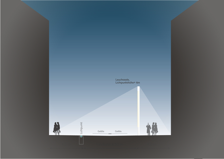 Ziel war ein über die reine Zweckbeleuchtung hinausgehendes Beleuchtungskonzept zu entwickeln und eine blendfreie Ausleuchtung der Wegebereiche mit geplanten Licht-Schatten-Zonen zu schaffen. Dabei wurde mit zwei unterschiedlichen Lichtobjekten gearbeitet, die im Zusammenspiel die gewünschte Lichtatmosphäre erzeugen, sich gegenseitig in ihrer Wirkung aber nicht beeinträchtigen. Um die Geradlinigkeit zu betonen und im Straßenraum erlebbar zu machen, wurden grün schimmernde Lichtpunkte im Abstand von ca. 14 m in den Boden eingelassen. Gegenüber entlang der Ostseite des Strassenprofils, sorgen 6m hohe Lichtstelen im Abstand von ca. 28 m für die nötige Ausleuchtung ohne die Lichtpunkte mit Strahlungsanteilen zu beaufschlagen.