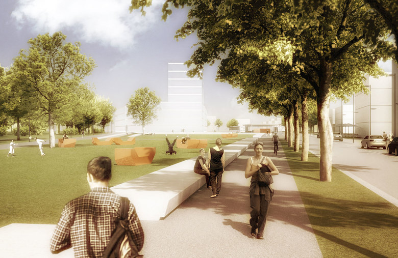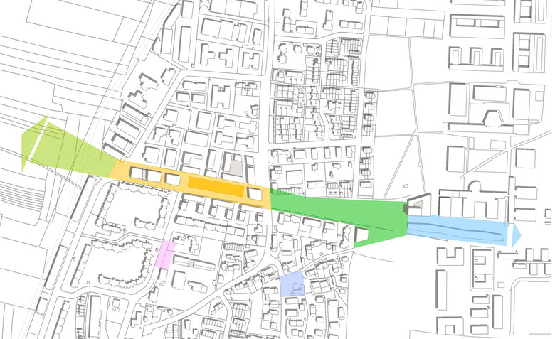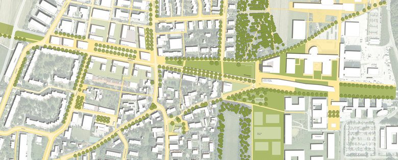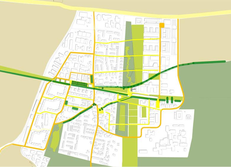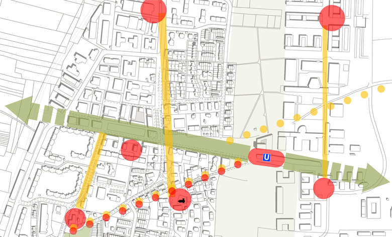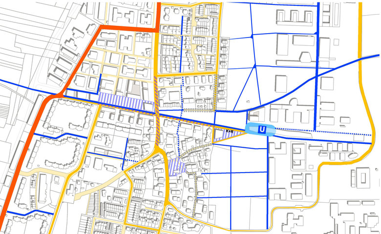 Die Situierung der U-Bahnendhaltetelle erfordert einen offensiven Umgang mit den zu erwartenden Verkehrsströmen. Ziel ist die Attraktivierung des öffentlichen Verkehrs und damit die schnelle und sichere Erreichbarkeit des U-Bahnhofes. Das übrige Straßennetz wird differenziert betrachtet und im Ortszentrum zum Teil als verkehrsberuhigter Geschäftsbereich sowie „Shared Space“ vorgeschlagen.
