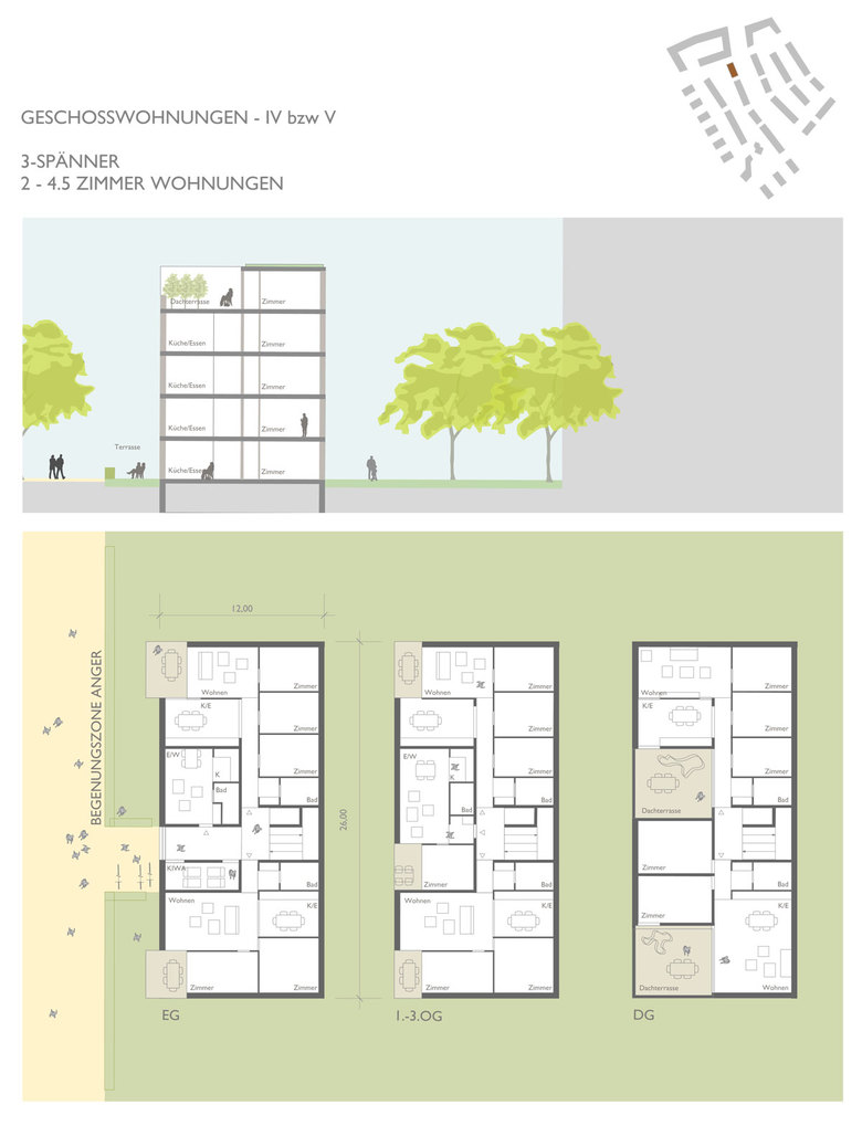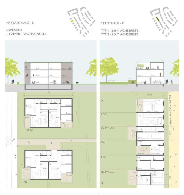 Das Baugebiet nimmt die, vor allem im östlichen Bestand vorhandene, nord-südgerichtete Gliederung auf. Ein zentraler Grünzug verbindet die Podbielskistrasse für Fußgänger und Radfahrer mit den Grünbereichen am Mittellandkanal. Östlich und westlich dieses Grünbereiches werden zwei angerartige Freiräume ausgebildet, um die unterschiedliche Haustypen und Wohnformen gruppiert sind. Den nördlichen Abschluss und Übergang zur Podbielskistrasse bilden zwei, die städtebauliche Figur vervollständigende, u-förmige Bauensembles, in denen u.a. eine Dialysezentrum sowie Räume für Dienstleistungseinrichtungen und Büros untergebracht sind.