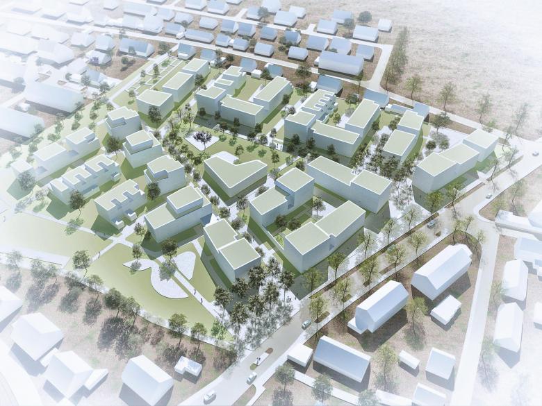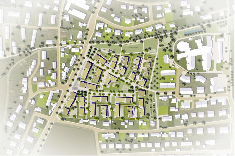 Die geplante Bebauung liegt im dreigeschossigen Bereich und erhält viergeschossige Akzente. Es wird eine ausgewogene Mischung aus Stadthäusern und Mehrfamilienwohnungsbau vorgeschlagen. Vorstellbar wäre auch eine Realisierung von Teilen der Bebauung in Baugruppen.