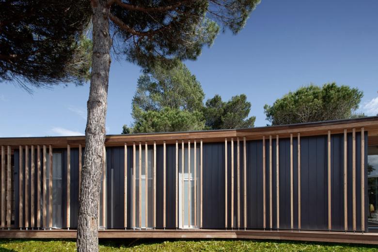 Ainsi une attention particulière est apportée à son insertion dans le site. Il est donc conçu comme une ligne topographique dessinée par un seul et même matériaux (du bois) lui offrant une unité spatiale mais aussi visuelle. C’est sous cette ligne de paysage constituée par une toiture plate que les entités du programme viennent prendre place. Elle a été pensée afin de mettre en valeur le paysage environnant tout en identifiant et protégeant des espaces extérieurs exploitables. Conçu dans la continuité des masses végétales environnantes ces limites atténuent l’incidence d’un nouveau bâtiment dans le paysage et créent un filtre visuel et auditif préservant les espaces de travail des nuisances extérieures. Ainsi, le bâtiment se compose d’un pli développant deux façades latérales constituée de manière homogène. Le projet propose une mise en retraits des façades vitrées et la mise en place de brise soleil en bois reliant les entités hautes et basses du pli. Ce dispositif permet de créer une épaisseur à la façade qui génère une protection solaire tout en pouvant profiter grâce à de larges ouvertures, d’une liaison directe entre l’intérieur et l’extérieur. Le dispositif permet également une continuité spatiale et visuelle tout en répondant aux contraires climatiques propre à la méditerranée. Le projet est entièrement construit en bois. C’est un choix environnemental que nous avons fait en travaillant avec des essences de pins locaux, mais aussi afin d’assurer une simplicité technique, constructive et fonctionnelle.