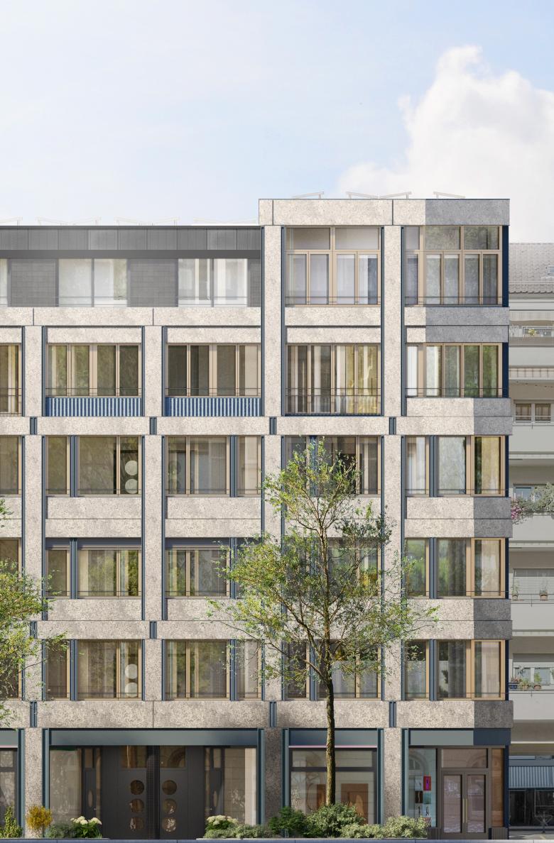 Das Wohngeschoss zeichnet sich durch eine leichte Veränderung der Gestaltungselemente aus. Das Attikageschoss wiederum als zweites Wohngeschoss setzt sich als dunkler Abschluss in Schiefer klar vom Hauptgebäude ab und stärkt somit dessen plastische Überhöhung. Die differenzierte Behandlung der Oberflächen, die plastische Ausformulierung der tektonischen Elemente im Zusammenspiel mit den bronzefarbenen Fenstern verleihen der Fassade eine hohe Wertigkeit und eine zeitlose Eleganz.