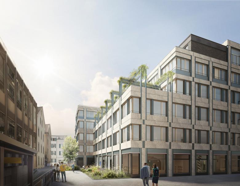 Ausgehend von einer ortstypischen geprägten Architektur, wird diese Formensprache neu interpretiert und in ein zeitgemässes Bürogebäude transferiert. Die hinterlüftete Fassade wird klassisch gegliedert mit Sockel, Mezzanin und Dachgeschoss. Profilierte Aluminiumelemente rahmen den Stein und ermöglichen maximale Freiheit der Gestaltung der Bürogeschosse.