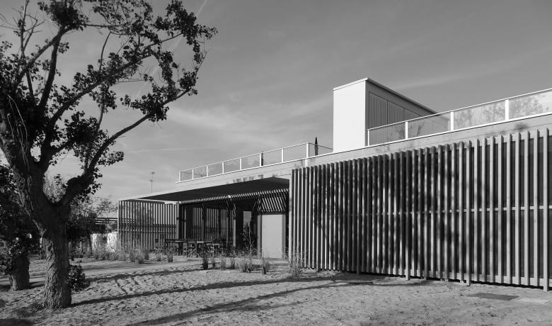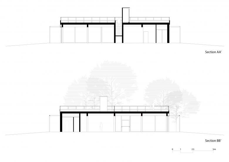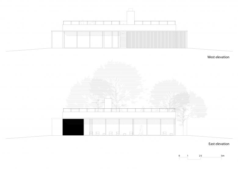 Il progetto è figlio di un linguaggio architettonico di matrice razionale, che rimanda alla leggerezza e trasparenza delle study-house californiane degli anni successivi alla guerra, con una sensibilità materiale locale accentuata dall’uso del legno, per gli elementi di schermatura orizzontali e verticali, e all’uso dei colori bianco e nero per integrarsi con il contesto ma senza passare inosservato. Inoltre, la presenza di un solarium sulla copertura con-sentirà ai fruitori un rapporto privilegiato con il panorama.