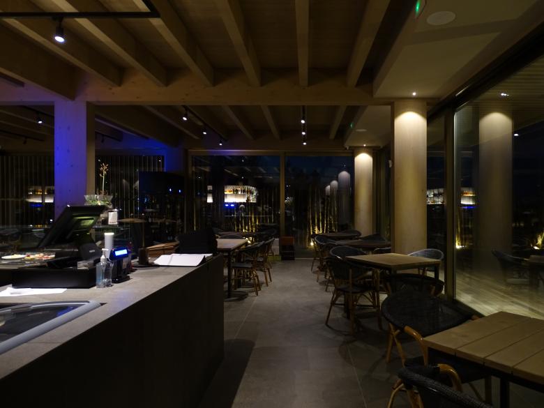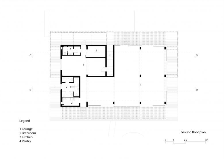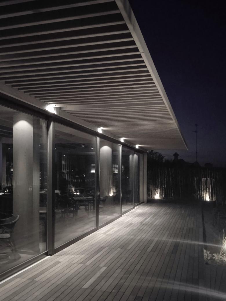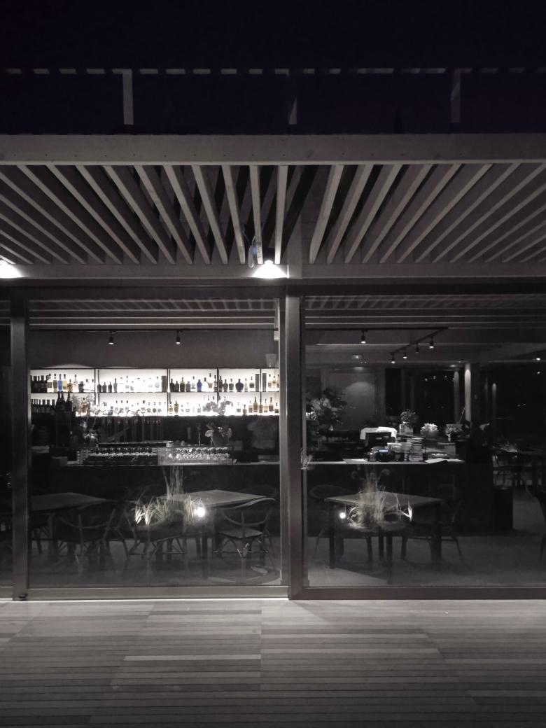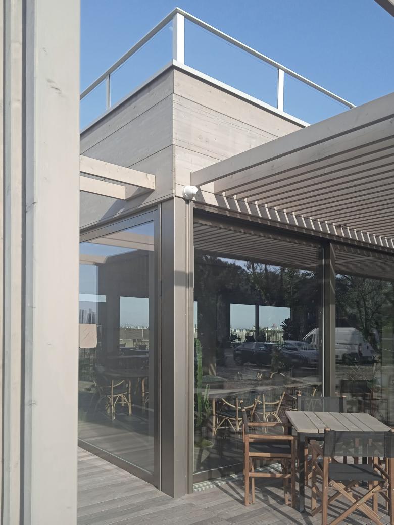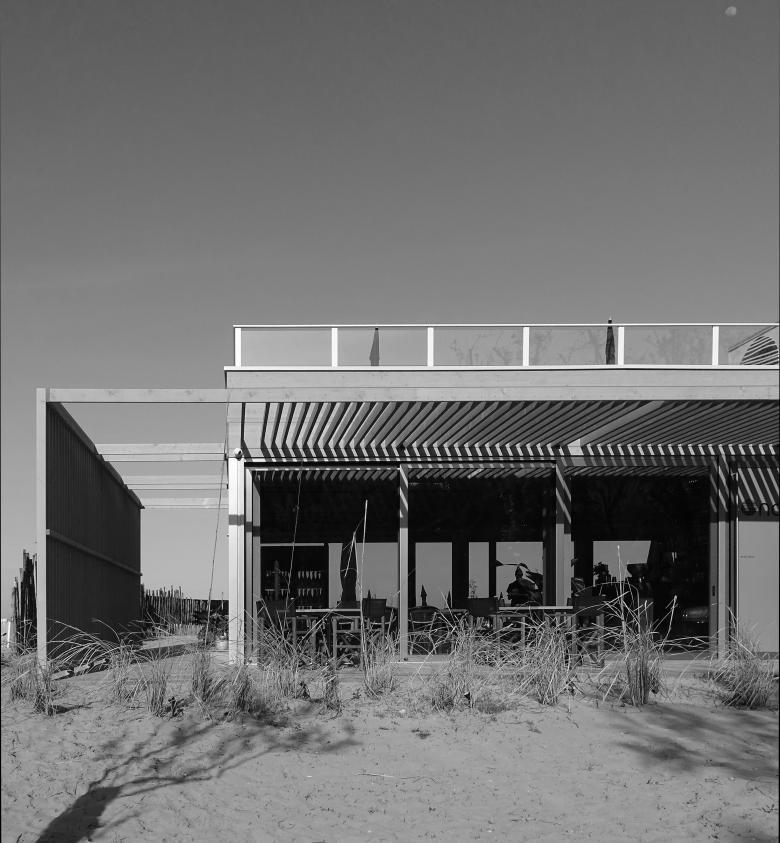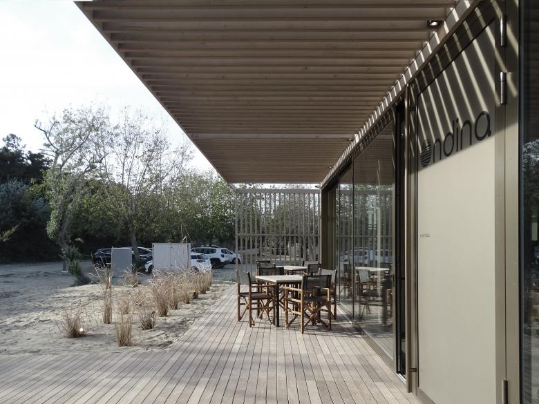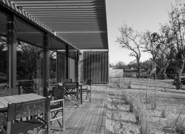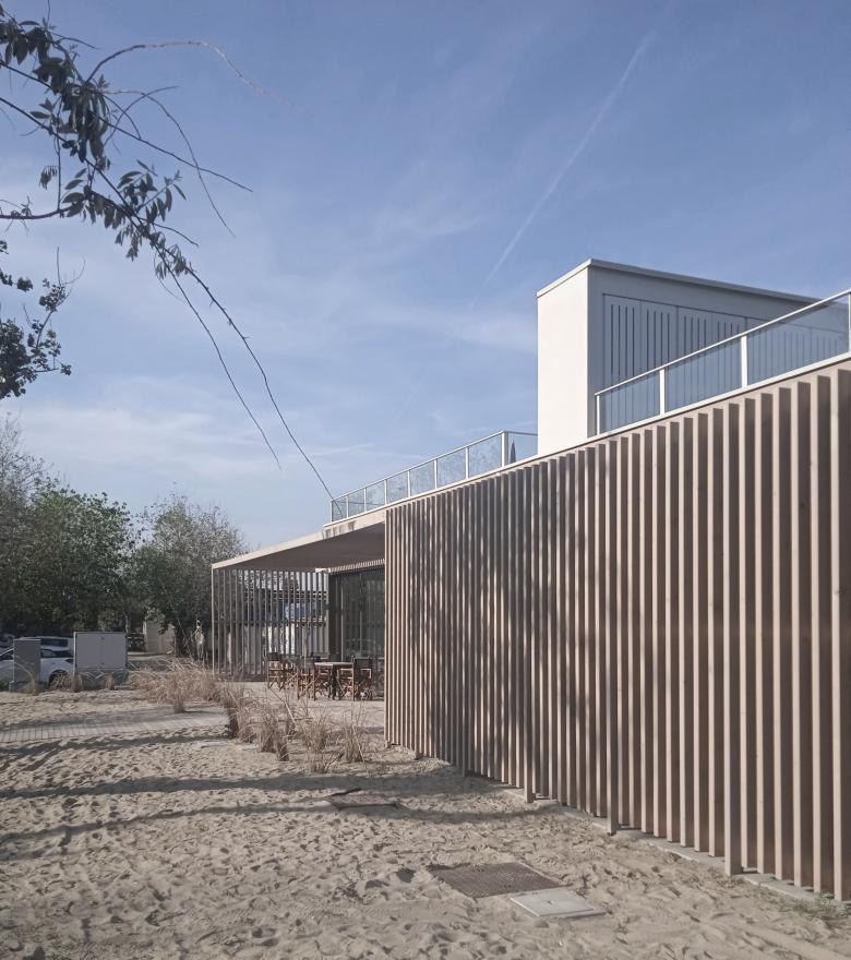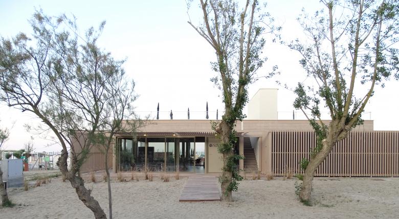 Il fronte, lungo 20 m, è caratterizzato da una vetrata ampia 5 m che mette in comunicazione visiva gli stradelli dal lato pineta, e il spiaggia antistante; l’edificio funge quindi da filtro visivo tra la pineta e il mare per alleggerire la percezione del manufatto in luogo fortemente naturale.