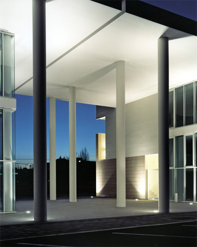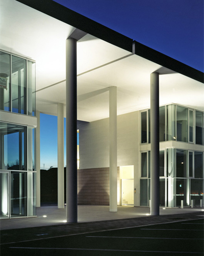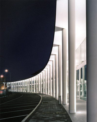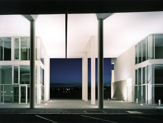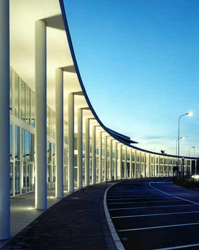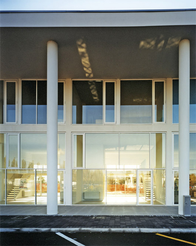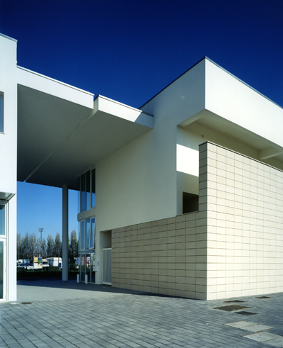 L’intervento, di nuova realizzazione, è localizzato su una delle principali arterie di circonvallazione esterna di Ravenna, nella prima periferia sud della città. Complessivamente l’edificato ha una superficie utile di 5000 mq per un altezza massima di quindici metri. Esso interpreta e sviluppa il progetto urbanistico planivolumetrico dettato dall’amministrazione pubblica, il quale fissava numero di piani e sagoma degli edifici. Come si evince dal materiale grafico, l’intervento si sviluppa in quattro edifici fuori terra di due e tre piani collegati fra loro da un portico di ordine gigante. Quest’ultimo raccorda e collega i quattro corpi, di forma allungata lievemente curva, in modo che complessivamente l’intervento sia percepibile come un unico e grande arco di cerchio.Sul lato nord, cioè sulla via Berlinguer, il progetto è caratterizzato da un porticato a colonne a doppia altezza su cui si affaccia il prospetto retrostante, completamente vetrato con infissi dal disegno geometrico scomposto. Gli altri tre lati sono invece caratterizzati da un rivestimento in gres posato sulle pareti del piano terra. Tale rivestimento, tagliando il complesso a metà in senso orizzontale, determina un prospetto più materico e compatto sul fronte sud. Gli edifici risultano di tre piani fuori terra: il piano terra commerciale è a doppia altezza (cinque metri) e presenta dei locali soppalcati, mentre i piani primo e secondo sono alti tre metri. In tutti e quattro gli edifici al piano terra sono presenti destinazioni commerciali e pubblici esercizi, mentre al primo e secondo piano dei due corpi centrali sono presenti uffici. Dal punto di vista costruttivo e delle finiture, l’intervento è stato realizzato con materiali tradizionali, al fine di ottimizzare il budget di previsione: struttura in cemento armato, murature in laterizio, intonaco e rivestimento in facciata ventilata in gres, infissi in alluminio verniciato con struttura autoportante, pavimentazioni interne in gres, esterne in gres e mattonelle autobloccanti, di cemento al naturale.