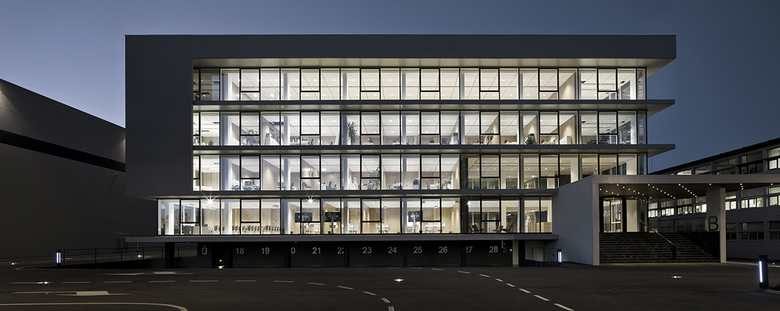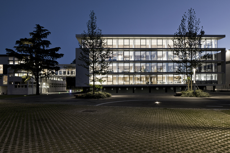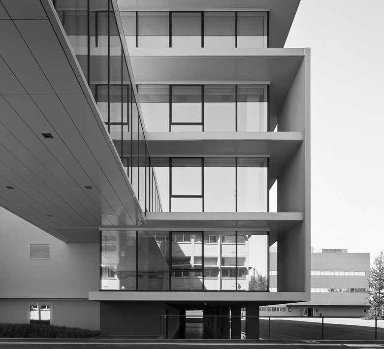 Il nuovo edificio per uffici è posto a cerniera fra la palazzina esistente (ed. A) e i depositi/laboratori (ed. C), situati al margine settentrionale dell’area.