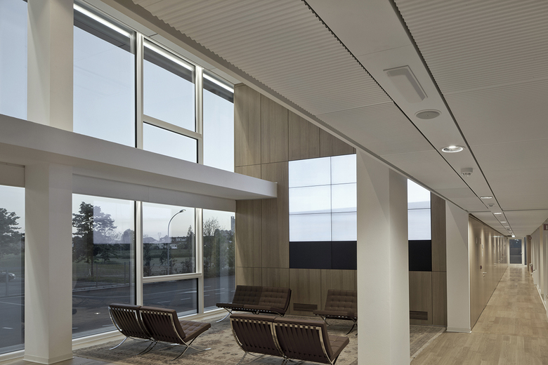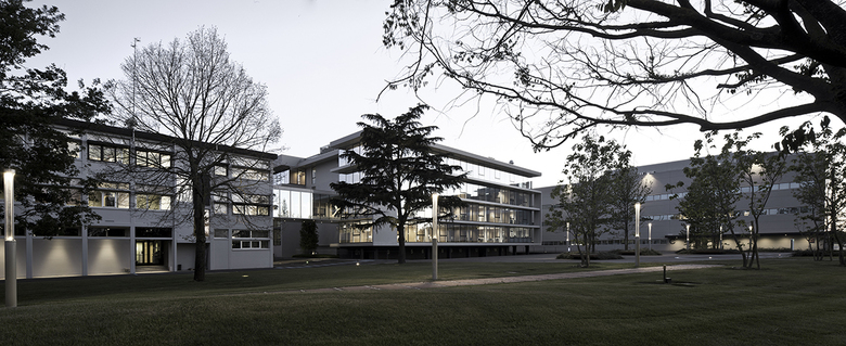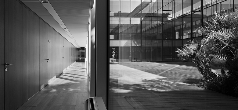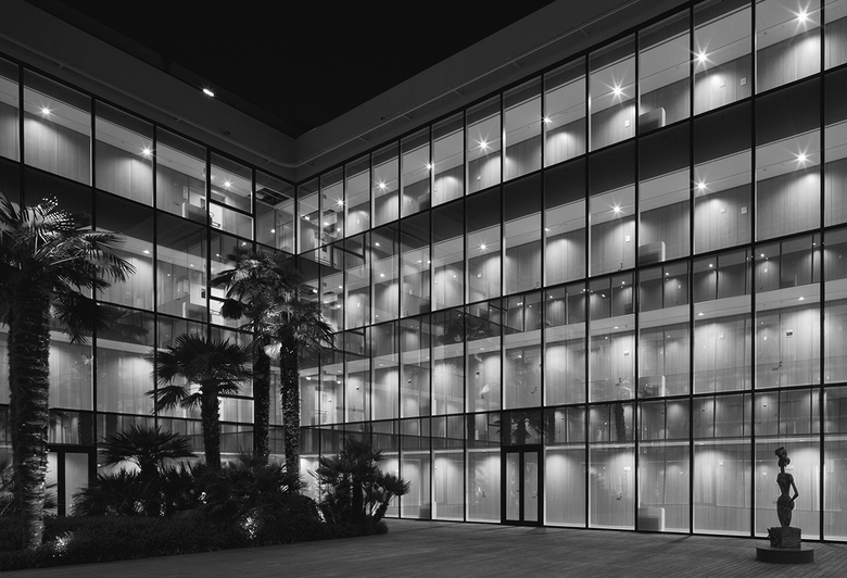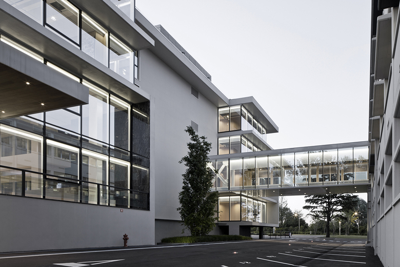 La nuova sede è collegata alla sede preesistente attraverso un tunnel trasparente realizzato in acciaio e vetro.