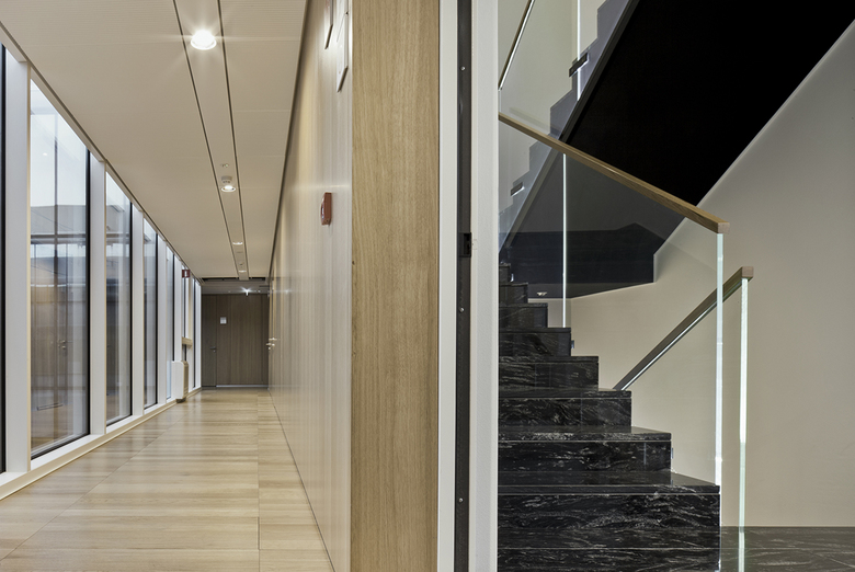 I restanti piani fuori terra, internamente suddivisi da pareti in arredo in legno di rovere, sono composti da ambienti per ufficio modulari. Il corridoio di distribuzione è anch’esso separato dagli uffici attraverso pareti-contenitore in legno di rovere, realizzate in arredo.