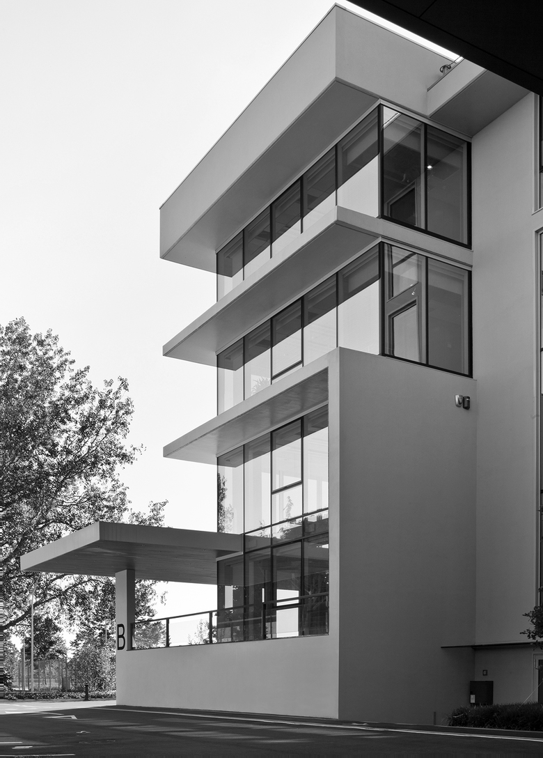 L’edificio poggia su un basamento seminterrato nel quale sono collocati i posti auto coperti e alcuni ambienti di servizio; l’esile pilastratura portante, posta in ombra dalla presenza delle ali perimetrali, e la finitura scura del seminterrato contribuiscono alla percezione del corpo di fabbrica come di un elemento quasi sospeso nel vuoto, posto ad un’altezza di m 1,50 dal piano stradale.