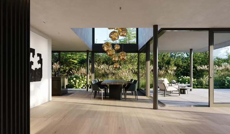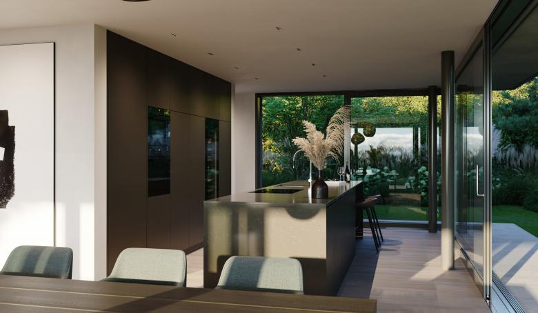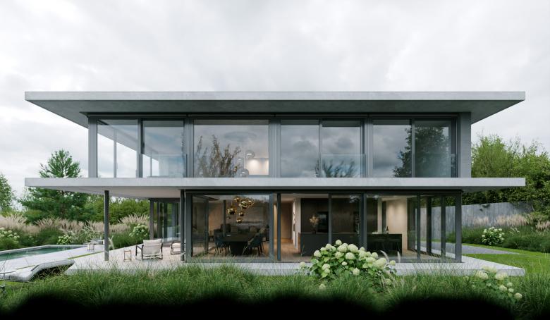 Grosszügige offene Räume, eine starke visuelle Verbindung des Innenraums mit dem Garten und Poolbereich, sowie ein zweigeschossiger Essbereich mit Bezug zur Galerie im Obergeschoss, charakterisieren den Entwurf dieser Villa oberhalb des Zürichsees.