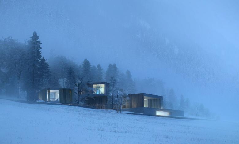 Vor der Kulisse eines geschützten, einheimischen Waldes wurden eine Reihe von hölzernen „Schattenboxen“, verhüllt mit Lamellen, auf steinernen Plattformen platziert und übereinandergestapelt, um gezielte Ausblicke zu rahmen. Diese sorgfältig proportionierte Komposition verwandelt das umfassende Raumprogramm in eine Abfolge intimer und dynamischer Erlebnisse – eine Oase, eingebettet in die umgebende Landschaft aus Wald, Wiesen und Bergen.
