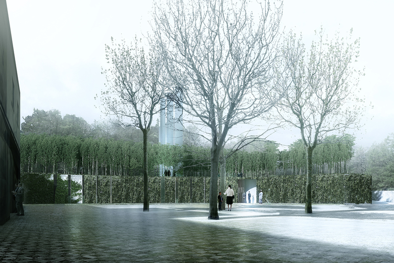 Obwohl das Gelände an einen bestehenden Garten im Renaissancestil grenzt, beginnt unsere architektonische Erzählung im Wald des Hörnli-Friedhofs. Der neue Weg führt durch das Waldinnere und eine Abfolge kontemplativer Räume, wobei sich das Triptychon der skulpturalen Schornsteine allmählich offenbart und so auf die Präsenz des Krematoriums hinweist. Der Wald schafft einen stillen, nachdenklichen Rahmen für Momente der Ruhe und des Innehaltens. Erinnerungen und Gefühle dürfen beim Gehen wirken, während Trauernde verschiedene Pfade und Räume erkunden.