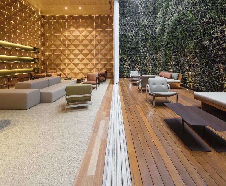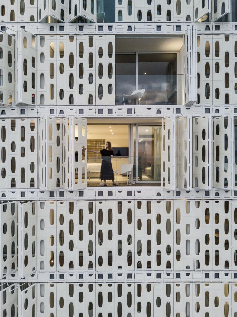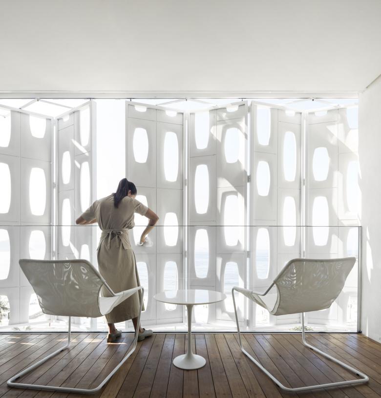 Das dichte und komplexe Stadtbild von Rio mit seinen vielen Rhythmen, Mustern und Maßstäben wurde in der Fassade des Hotels bewusst beruhigt, um einen Moment der Ruhe und Gelassenheit zu schaffen. Die bewegliche, skulpturale Fassade wird von den Gästen direkt aus ihrer Suite gesteuert. Diese bodentiefen, perforierten Paneele filtern das Sonnenlicht, ohne dabei die Lüftung oder den Ausblick auf die Küste einzuschränken. Diese lebendige, sich ständig verändernde Wand interpretiert das klassische Cobogó neu – ein offener, keramischer Baustein, der typisch für die brasilianische Architektur der 1950er Jahre ist.