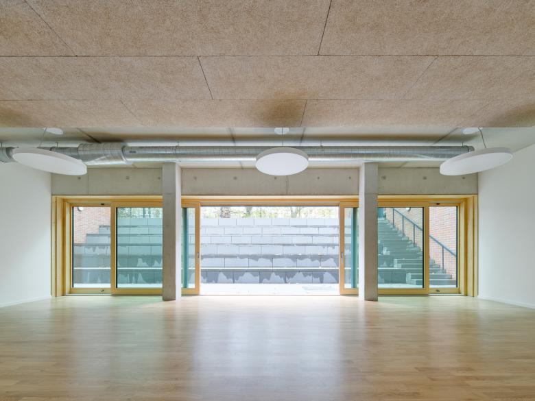 Das neue Verwaltungsgebäude des Amts für kirchliche Dienste fügt sich maßvoll und dennoch selbstbewusst in die vorhandene städtebauliche Situation des bestehenden Ensembledenkmals ein und führt die prägenden Gestaltungsprinzipien der offenen Baustruktur, des fließenden Raums sowie der bisher angewandten Konstruktions- und Gestaltungsprinzipien präzise fort.