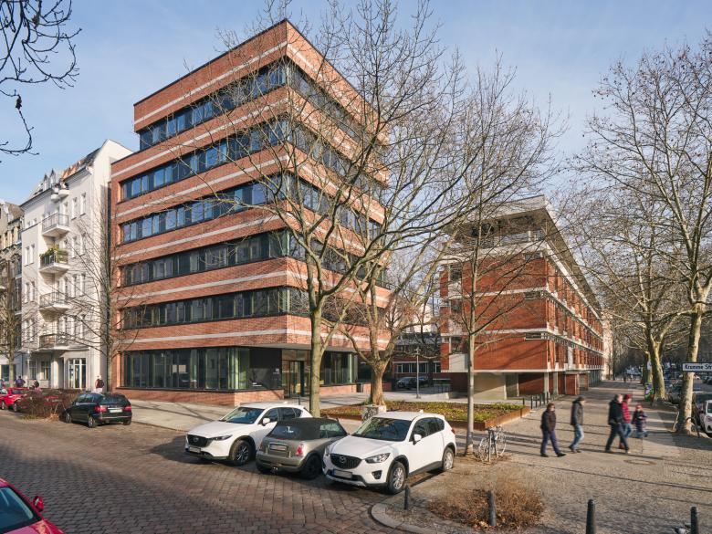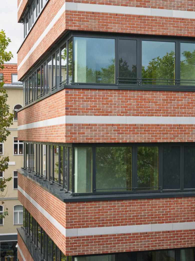 In seiner figurativen Ausprägung reagiert der Baukörper stärker als sein Vorgänger auf die städtebaulichen Gegebenheiten seiner unmittelbaren Nachbarschaft. In seiner Höhenentwicklung vermittelt der Neubau zum angrenzenden Bestand, indem er die Traufkante der Blockrandbebauung sensibel aufnimmt und diese mit seinem Staffelgeschoss zu einem markanten städtebaulichen Akzent am Eingangsplatz Ecke Goethestraße/Krumme Straße weiterführt.