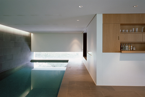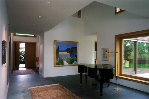 Der äusseren Ungerichtetheit der Skulptur, die z.B. die Geschossigkeit überspielt, entspricht eine innenräumliche Komplexität, die durch den zweigeschossigen Galerieraum strukturiert wird.Der Weg durch das Haus ist zielgerichtet und endet in jeweils neuen, überraschenden Raumsituationen und Ausblicken. Alle Wege finden aber wieder zurück in die Halle und kreuzen sich dort.In diesem Sinne sind das Wohnen (EG) die Galerie (OG) und die Halle mit dem Büro (DG) ein räumliches Kontinuum.