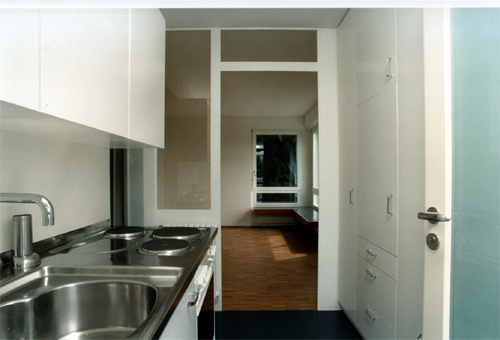 Im zweiten Wohngeschoss wurden jeweils zwei Wohnungen zu einer grösseren 2-Zimmer-Wohnung zusammengelegt.Mit einem grösseren Fenster auf dem Laubengang wurde neu auch eine Orientierung hin zur Stadt ermöglicht. Im dritten Wohngeschoss, einer neuen Aufstockung, wurde ein Einraum-Konzept realisiert, bei dem die Nutzungen in Nischen liegen, die durch ein in der Mitte stehendes Möbel generiert werden.
