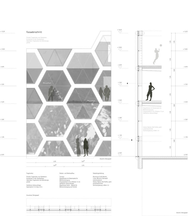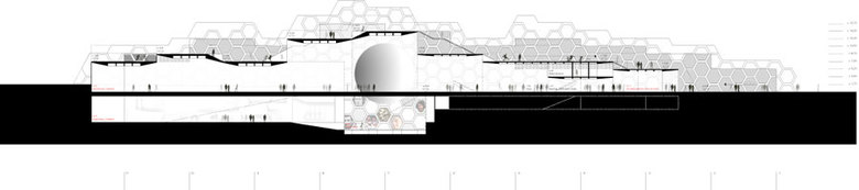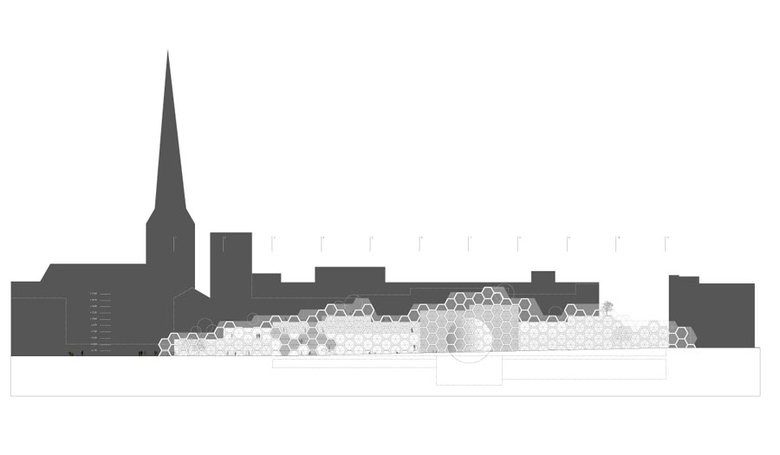 Die benutzbare Oberfläche des Museumsgebäudes schafft Mehrwert sowohl für den Betreiber als auch für die Stadt. Die getreppte Höhenentwicklung des Gebäudes, die entlang der Kulturmeile rhythmisch an- und absteigt, erzeugt eine „Landschaft“, die ein Spiel mit der bestehenden Stadtlandschaft aufnimmt. Das Museum ist insgesamt relativ niedrig, erreicht mit seinem obersten Terrassenfeld eine Gebäudehöhe von ca. 15,5 m und ist somit deutlich niedriger als die Gebäude an der Stadtkante, welche so in seiner Stadtbildwirkung insgesamt wahrnehmbar bleibt.